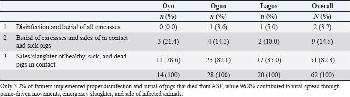 The overall mortality rate was 60.6%. Farm size reduction was driven by mortality, panic sales, emergency slaughter, and relocation of affected pigs, resulting in herd size declines ranging from 75.8% to 100% within the first 30 days of the outbreak (Table 5). The estimated financial loss was ₦166,264,000 ($436,961.90 USD) (Table 6). Most farmers (96.8%) contributed to viral spread by moving, slaughtering, and selling infected pigs to mitigate losses (Table 7 and Fig. 3).