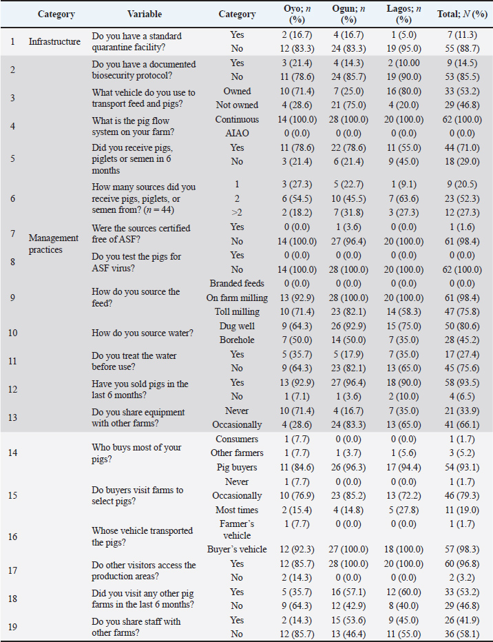 AbstractBackground: African swine fever (ASF), a highly contagious, hemorrhagic viral disease of pigs, continues to decimate the global pig population. Aim: This study was designed to investigate key field events, morbidity patterns, mortality rate, clinical findings in pigs, and biosecurity breaches on farms during the ASF outbreak in Southwest Nigeria (2019–2021). Methods: Farms (n=62) accommodating 6,208 pigs in Oyo, Ogun, and Lagos states were investigated. Information on the demographic characteristics of farmers, their knowledge of and experience with ASF, the sequence of morbidity onset across age groups, and the rate of farm size reduction was obtained using structured questionnaires. Clinical findings in diseased pigs and biosecurity breaches related to farm infrastructures and management practices were observed and assessed using a modified standard template. Data were analyzed using descriptive statistics and chi-square at p < 0.05. Results: Most of the farmers were between 40 and 60 years old and were predominantly men. A significant proportion had over 5 years of experience, and most had a pre-outbreak herd of 200 pigs or less. Many farmers had experienced previous ASF outbreaks leading to losses. Pig age was associated with the sequence of morbidity onset, with the most frequent sequence being adults → piglets → weaners → growers. Mortality, farm size reduction, and financial loss were 60.6%, 92.1%, and ₦166,264,000, respectively. Clinical findings were consistent with hemorrhagic fever in pigs. Biosecurity breaches include a lack of quarantine facilities, limited use of fencing, gating, foot dips, and netting, pig farm aggregation, continuous pig flow on farms, poor vehicle disinfection, uncertified replacement stock, open waste dumping, uncontrolled visitor access, and unrestricted pig movement. Conclusion: Biosecurity breaches across farm infrastructure, management practices, and human behavior aided the spread of ASF in Nigeria, leading to significant economic losses. Strengthening biosecurity, regulating pig movement and market activities, educating stakeholders, and ensuring government led surveillance and compensation are critical to controlling ASF and safeguarding Nigeria’s pig industry. Keywords: African swine fever, Mass mortality; Panic sales, Pig disease, Biosecurity breaches. IntroductionPig production continues to serve as a crucial source of animal protein and income generation for many sub-Saharan African countries (Janse van Rensburg et al., 2022), with Nigeria ranking among the continent’s foremost pig producers (Robinson et al., 2014, Adesehinwa et al., 2024). Between 1984 and 1997, Nigeria experienced rapid growth in its pig population, expanding from approximately 2 million to over 7 million pigs. However, this upward trend was disrupted by the first officially confirmed outbreak of African swine fever (ASF) in 1997 (Odemuyiwa et al., 2000; Fasina et al., 2010). Subsequent outbreaks caused extensive losses in pig populations with lasting social and economic consequences (Otesile et al., 2005; Babalobi et al., 2007; Igbokwe et al., 2018; Omotosho, 2020). The disease has since emerged as a major constraint to pig farming in Nigeria, significantly impeding industry growth and profitability (Ebwanga et al., 2021; Ogundijo et al., 2023). Recurring outbreaks have been documented in vital pig producing and marketing hubs, particularly in the southwestern, central, and eastern regions of the country (Fasina et al., 2010; Owolodun et al., 2010; Igbokwe et al., 2018). The disease also remains endemic across many sub-Saharan African nations, with recent incidents reported in West African countries, such as Togo, Benin, Senegal, Côte d Ivoire, The Gambia, Burkina Faso, Ghana, Guinea Bissau, Mali, Guinea, Sierra Leone, and Nigeria (Wadoum et al., 2020). ASF poses a significant threat to food security across the African continent and is associated with considerable economic damage (Fadiga et al., 2013; Gebreyohannes, 2015). The disease continues to expand its geographic reach, affecting pig populations in multiple regions globally, thereby endangering the sustainability of pig farming worldwide (Blome et al., 2020; De Lorenzi et al., 2020). This acute, hemorrhagic viral disease targets the Suidae family, impacting both domestic and wild pig populations. It was first identified in Kenya in 1909 following the introduction of European domestic pigs (Montgomery, 1921; Mulumba-Mfumu et al., 2019). Since then, the virus has spread extensively across domestic pig populations in sub–Saharan Africa and beyond (Sánchez-Cordón et al., 2018). ASF persisted in Africa until it was likely introduced from Angola to Portugal in 1957 (Boinas, 2011; Danzetta et al., 2020; Ito et al., 2023). The disease is caused by the African swine fever virus (ASFV), a large, enveloped double stranded DNA virus (Rock, 2021). ASFV belongs to the genus Asfivirus within the family Asfarviridae and is the only known DNA arbovirus. The soft tick Ornithodoros spp. serves as its natural reservoir and biological vector (Njau et al., 2021; Jori et al., 2023). Domestic pigs (Sus scrofa) are highly susceptible to ASFV infection; however, subclinical infections have been observed in certain African wild pig species, including bush pigs (Potamochoerus spp.), warthogs (Phacochoerus spp.), and giant forest hogs (Hylochoerus meinertzhageni), which act as natural reservoirs (Stahl et al., 2019; Fischer et al., 2020). Under field conditions, ASF has an incubation period ranging from 4 to 19 days (Mebus et al., 1983, USDA, 2023), and infected pigs begin shedding the virus before clinical signs appear. High viral titers are typically present in all bodily fluids, including saliva, nasal secretions, feces, urine, conjunctival discharge, genital secretions, and blood from wounds, making transmission highly efficient (Sánchez-Vizcaíno et al., 2019). Surviving pigs may become chronic carriers and shoul