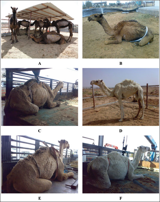Fig. 1. Clinical presentation of 6 dromedary camels with paratuberculosis in a group (A) and separate cases (B, C, D, E, and F). Progressive weakness, severe loss of body conditions, chronic and/or intermittent watery diarrhea, abdominal pain, decreased body condition score, and anorexia were the admission complaints. In camels with PTB, biochemical changes included hypoalbuminemia, hypoproteinemia, hypoglobulinemia, hypomagnesemia, hypoglycemia, and increased AST activity. However, γ-glutamyl transferase activity and the serum concentrations of blood urea nitrogen, total bilirubin, calcium, phosphorus, and creatinine did not alter significantly versus healthy controls (Tharwat et al., 2012a). In another study carried out also by our group (Tharwat et al., 2013), the same hematological alterations were recorded and included decreased HCT, leukocytosis, and lower HGB concentration. In addition, biochemical variables change include hypoalbuminemia, hypoproteinemia, hyperglobulinemia, and increased concentration of magnesium and calcium (Tharwat et al., 2012a). The hyperglobulinemia in the latter study was referred to as the chronic nature of the disease in camels. The hypoproteinemia and hypoalbuminemia could all be attributed to the malabsorption caused by diarrhea (Tharwat et al., 2012a). Sonographic findingsUltrasonography has been confirmed as a safe, very beneficial for diagnosis of several diseases and disorders of the gastrointestinal tract in dromedary camels (Tharwat et al., 2012a,b,c; Tharwat et al., 2013; Tharwat and Al-Sobayil, 2016; Tharwat et al., 2018; Tharwat, 2019; Tharwat, 2020; Sadan et al., 2024; Tharwat, 2024; Tharwat et al., 2024b,c,d,e; Tharwat and Tsuka, 2024). As a rapid screening test for dromedary camels with suspicion to be affected with PTB, clinicians may use sonography to image the abdominal viscera, especially the intestines and mesenteric lymph nodes (LNs) (Tharwat et al., 2012a). Usually, the intestinal wall becomes either mildly, moderately, or severely thickened (6.8 ± 1.9 mm; 12.8 ± 4.6 mm, and 17.5 ± 3.6 mm, respectively) versus a thickness of 3.6 ± 1.2 mm in healthy non-affected camels. Visualizing of enlarged mesenteric LNs was also reported (Tharwat et al., 2012a). The LN capsule was either anechoic or echoic, and the contents were either echogenic, anechoic, or heterogenous. Other sonographic findings include bright hepatic parenchyma, aggregation of echogenic materials separated with fluids among the intestines, and pleural and pericardial effusions (Fig. 2) (Tharwat et al., 2012a). Pathologic findingsAt postmortem examination, camels with PTB are usually emaciated. The typical pathological lesions are corrugation of the small intestinal mucosa especially that of the ileum that reaches 3–4 times than in normal camels, and the colonic mucosa is folded. Mesenteric and ileocecal LNs are edematous, congested, and granular (El Tigani-Asil et al., 2023). Over the hepatic tissue, dispersed varied sizes and shapes of whitish granulomatous lesions are found (Hereba et al., 2015). It was reported in another study that necropsy findings in a camel with PTB were corrugation and thickening of the ileocecal part of the intestines and the cut section showed corrugation and folding of the mucosa. In addition, the mesenteric LNs were enlarged that showed mottled appearance, firm consistency, and caseation, and the liver showed fatty degeneration, nutmeg appearance, hepatic necrosis, passive congestion, atrophy, and fatty change (Tigani-Asil et al., 2023). In a study conducted by Alharbi and colleagues (2012), postmortem findings in camels with PTB included corrugated and thickened intestinal mucosa, granulomatous and enlarged mesenteric LNs, diffuse and miliary granulomas in the liver, generalized LN granulomas, and splenic granuloma and mediastinal LN granuloma. In a large study conducted by our group (Tharwat et al., 2012a), camels with PTB showed diffuse corrugation and thickening of the small intestinal mucosa. In addition, the large intestine mucosa is ulcerated, hemorrhagic, and folded (Fig. 3). The mesenteric and hepatic LNs may be enlarged, granulomatous and the surface was hemorrhagic on the cut section. Other necropsy findings include fatty liver and peritoneal, pericardial, and pleural effusions (Tharwat et al., 2012a). In another report, a necropsy of camels with PTB revealed thickened and folded intestinal mucosa with a granulomatous appearance seen from the serosa. The granulomas were also observed in the hepatic, mesenteric, and mediastinal LNs. Other findings included flabby heart, enlarged kidneys, and hydroperitoneum (Tharwat et al., 2013).