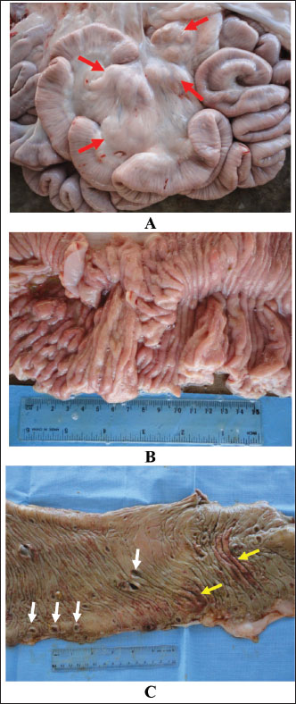 Fig. 3. Intestinal mucosa in a camel with paratuberculosis showing enlarged mesenteric lymph nodes (A, red arrows), thickening and corrugation of small intestines (B) and ulcerated and hemorrhagic large intestine (C, white arrows, ulceration; yellow arrows, hemorrhage). Histologically, proliferative enteritis and lepromatous granulomas were detected. Clusters of acid-fast bacilli were found also in the mucosa and lamina propria. Sectioning of the enlarged mesenteric LNs showed a diffuse lepromatous reaction with a proliferation of epithelioid cells and macrophages mixed with mononuclear cells and lymphocytes without proof of calcification and caseation (Tigani-Asil et al., 2023). In another study, histopathological examination showed intense invasion of epithelioid cells in the mucosa as well as the submucosa and the enlarged LNs, showing liquefactive necrosis and abscess formation (Tharwat et al., 2013). In a third study, histopathological findings included diffuse infiltration of macrophages in organs revealing lesions and staining of tissue scraping and tissue sections by Ziehl–Neelsen showed clusters of acid-fast bacilli (Alharbi et al., 2012).
