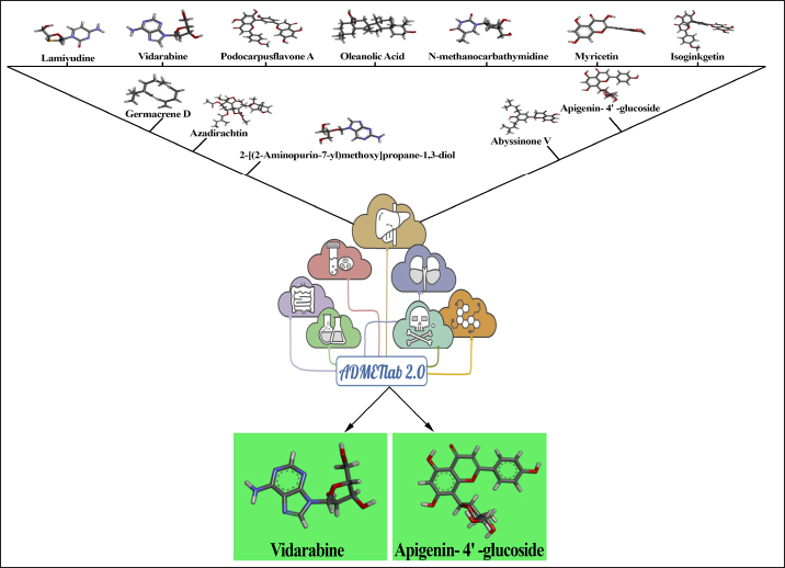 Fig. 1. Selection of potential bioactive compounds and ADMET pharmacokinetic profiling of apigenin-4’–glucoside and vidarabine. Homology modeling and structural refinementHomology modeling method was used to build the three-dimensional structures of LSDV proteins, was modeled via SWISS-MODEL server (Guex et al., 2009; Waterhouse et al., 2018). Template structures were taken with high sequence similarity to the target LSDV proteins, specifically ankyrin proteins (5y4f, 5le7.2.A), DNA (5n2g), and RNA (6ric, 7amv, 6rfl, 6rid) polymerases, glycoproteins (3k7b, 2ox9, 7ul6), and membrane proteins (6v36, 8c8g, 8c03, 8ss6, 6c6l, 6v36) to build model structures. The selected templates, derived from structurally resolved proteins with known homologous sequences, served as the basis for generating the structural models. The SWISS-MODEL server employs advanced algorithms to predict the atomic coordinates of the target proteins, incorporating template-based modeling methodologies. Subsequently, the generated models underwent meticulous validation using state-of-the-art tools such as PROCHECK (Laskowski et al., 1993). The 3D models were then improved using 3Drefine (http://sysbio.rnet.missouri.edu/3Drefine/) online protein structure refinement servers in a two-step procedure (Bhattacharya et al., 2013). Pharmacokinetic profiling and phytochemicals selectionThirteen active phytochemical compounds (Podocarpusflavone A, Isoginkgetin, Vidarabine, Lamivudine, Mycophenolic acid, Azadirachtin, N-methanocarbathymidine, 2-[(2-Aminopurin-7-yl)methoxy]propane-1,3-diol, Germacrene D, Oleanolic Acid, myricetin, apigenin- 4’ –glucoside, Abyssinone V) were taken from the previously reported literature which were implicated in potential therapeutic interventions against capripoxvirus (Bagla et al., 2012; Sadgrove et al., 2020; Kim et al., 2022; Mustafa et al., 2023; Chiem et al., 2023;). Subsequently, the PubChem database (https://pubchem.ncbi.nlm.nih.gov/) was utilized to download the structure data file format for each of these compounds. To ascertain their drug-likeness-based absorption rates, distribution within the body, metabolism, excretion, and potential toxicity properties, an analysis was conducted using the ADMETlab 2.0 web server (Lei et al., 2016). Molecular dockingMolecular docking analyses were conducted using AUTO DOCK v4.2.6 to explore the potential binding interactions between the identified active phytochemical compounds and key LSDV proteins, including ankyrin proteins, DNA and RNA polymerases, glycoproteins, and membrane proteins (Forli et al., 2016). The docking process aimed to predict the binding modes and affinities of the phytochemicals within the active sites of the target proteins. In order to run the Autodock genetic algorithm, the ligands were ready for docking, and the grid size (X=60; Y=60; Z=55) and center were specified. The binding energy scores were computed, providing quantitative insights into the strength of the ligand-protein interactions. Post-docking, the results were further scrutinized and visualized using Discovery Studio Visualizer v20.1.0.19295 to gain a comprehensive understanding of the molecular interactions, including hydrogen bonds, hydrophobic contacts, and other key binding features (Riyaphan et al., 2021). MD simulationUsing the GROMACS software, 5 nanosecond simulation was executed with the integration of both NPT (constant Number of particles, Pressure, and Temperature) and NVT (constant Number of particles, Volume, and Temperature) ensembles (Bekker et al., 1993). The simulation maintained a constant temperature of 310 K, mimicking physiological conditions. The CHARMM27 force field was employed to model the intermolecular interactions and energetics. Throughout the simulation, the trajectories of the phytochemicals within the LSDV protein binding sites were closely monitored. Post-simulation, the root mean square deviation (RMSD) was calculated to quantify the overall stability and deviation of the ligand-protein complexes over time. Additionally, the root mean square fluctuation (RMSF) was assessed to elucidate the flexibility and dynamic fluctuations of specific residues within the LSDV protein complexes. Ethical approvalThis article does not contain studies with animal or human subjects performed by any of the authors. So, the requirement of ethical approval is inapplicable for this article. ResultsSelection of active compounds through ADMET studyNumerous phytochemicals were already reported as potential candidates for combating capripoxvirus, including Podocarpusflavone A, Isoginkgetin, Vidarabine, Lamivudine, Mycophenolic acid, Azadirachtin, N-methanocarbathymidine, 2-[(2-Aminopurin-7-yl)methoxy]propane-1,3-diol, Germacrene D, Oleanolic Acid, myricetin, apigenin-4’–glucoside, and Abyssinone V. While these compounds have shown promise in various studies, the selection of the most suitable candidate for further investigation necessitates a meticulous evaluation of drug-likeness properties, encompassing absorption rates, distribution within the body, metabolism, excretion, and potential toxicity. To address this crucial aspect, we conducted a comprehensive analysis using the ADMETlab 2.0 web server. This analytical approach facilitates a systematic assessment of the pharmacokinetic properties of each candidate, aiding in the identification of the most promising compound for subsequent in-depth studies. Following this rigorous analysis, apigenin-4’-glucoside and Vidarabine emerged as the most favorable candidate; demonstrating superior drug-likeness attributes (Supplementary Table 1: can be requested from the corresponding author). Molecular dockingTo identify potential antiviral compounds against LSDV, a comprehensive molecular docking study was conducted. Following an initial screening based on ADMET parameters, a total of sixteen protein structures were taken for docking analysis to reveal interactomics. Interactome profile of apigenin-4’-g