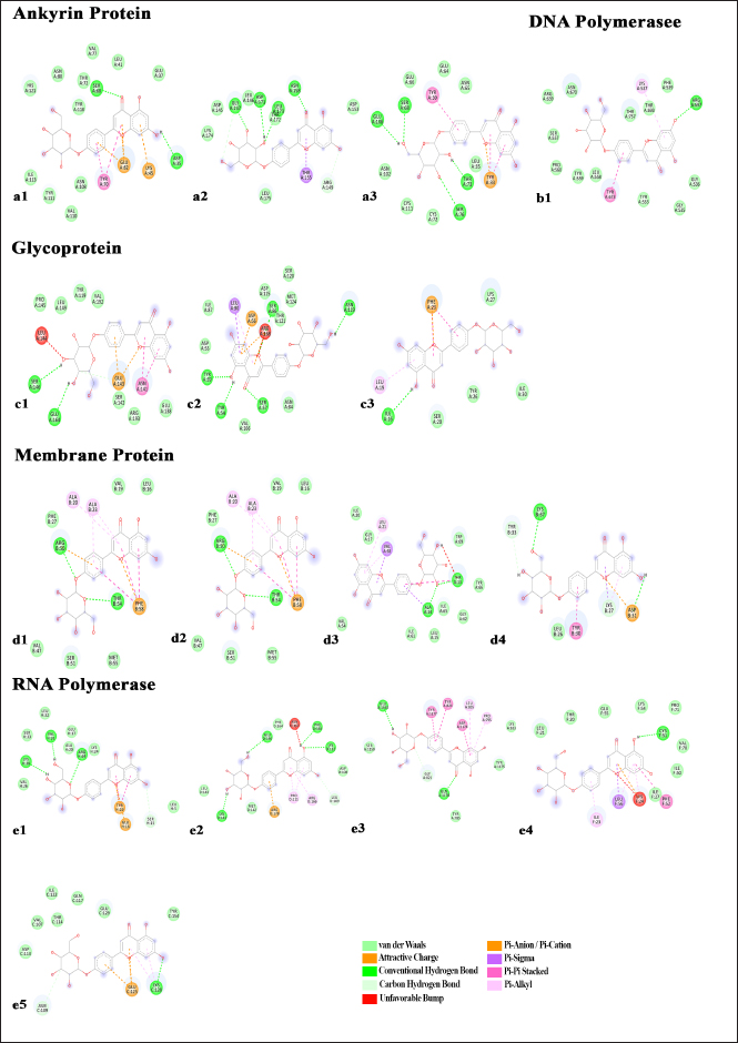 Fig. 2. Interactome profile of Ankyrin protein (a1 – a3), DNA polymerase (b1), Glycoprotein (c1 – c3), membrane protein (d1 – d4) and RNA polymerase (e1 – e5); with Apigenin-4’-glucoside.
