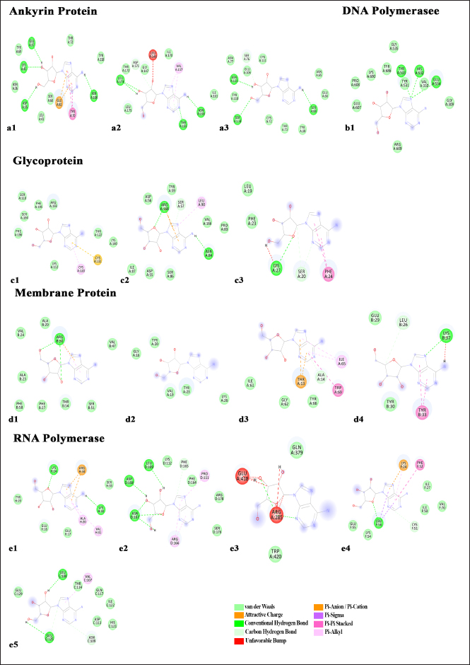 Fig. 3. Interactome profile of Ankyrin protein (a1 – a3), DNA polymerase (b1), Glycoprotein (c1 – c3), membrane protein (d1 – d4) and RNA polymerase (e1 – e5); with Vidarabine. Additionally, RNA polymerase interactions (NP_150489.1) showed 13 in all, 3 of which were covalent hydrogen bond, 2 Pi-Cationa, and 1 Cation Hydrogen bond with corresponding binding free energy of −6.7 kcal/mol; A total of 13 interactions were detected in the RNA polymerase (NP_150503.1) with corresponding binding free energy of −6.9 kcal/mol; on the other hand RNA polymerase (NP_150505.1) showed total 12 interactions with corresponding binding free energy of −8.9 kcal/mol; RNA polymerase (NP_150519.1) showed total 13 interactions with corresponding binding free energy of −6.1 kcal/mol; Lastly total 10 interactions were detected with RNA Polymerase (NP_150530.1) with corresponding binding free energy of −5.9 kcal/mol. A total number of interactions of apigenin-4’-glucoside with Ankyrin protein, DNA polymerase, Glycoprotein, membrane protein and RNA polymerase were represented in Figure 4. The highest number of interactions were documented in case of Apigenin-4’-glucoside when compared with Vidarabine. Interactome profile of VidarabineVidarabine also emerged as one of the most promising drug candidates, exhibiting favorable pharmacokinetic properties. The subsequent molecular docking analyses involved a total of sixteen docking complex generation (Fig. 3), exploring the interactions between Vidarabine and various LSDV proteins, including ankyrin proteins, DNA polymerase, RNA polymerase, membrane proteins, and glycoproteins. Three docking interactions were investigated using Vidarabine, the ankyrin protein (NP_150581.1) exhibited a total of 12 interactions, with corresponding biding free energy of -6 kcal/mol; the ankyrin protein (NP_150582.1) showed 12 interactions in all, with corresponding biding free energy of −4.9 kcal/mol; A total of 13 interactions were detected in the ankyrin protein (NP_150586.1), with corresponding biding free energy of −5.8 kcal/mol. In the case of DNA polymerase, a single docking interaction was studied (NP_150473.1) and revealed a total of 12 interactions with providing insights into the binding energy of −5.8 kcal/mol with apigenin-4’-glucoside. Three docking study were carried out for glycoprotein proteins, unraveling intricate ligand-protein interactions; glycoprotein (NP_150556.1) showed total 10 interactions with corresponding binding free energy of −5.2 kcal/mol; with glycoprotein (NP_150557.1) revealed total 11 interactions with corresponding binding free energy of −5.7 kcal/mol; and lastly glycoprotein (NP_150560.1) showed total 5 interactions with corresponding binding energy of −3.4 kcal/mol. Membrane proteins were the focus of four docking interactions; first membrane protein (NP_150534.1) showed total 9 interactions with corresponding binding free energy of −4.7 kcal/mol; with corresponding binding free energy −3.5 kcal/mol membrane protein (NP_150538.1) showed total 5 interactions; membrane protein (NP_150539) showed total 7 interactions with binding free energy of −4.1 kcal/mol; membrane protein (NP_150546.1) showed total 5 interactions with binding free energy of −3.9 kcal/mol. Additionally, RNA polymerase interactions (NP_150489.1) showed 9 in all with corresponding binding free energy of −4.7 kcal/mol; A total of 10 interactions were detected in the RNA polymerase (NP_150503.1) with corresponding binding free energy of −5.6 kcal/mol; on the other hand RNA polymerase (NP_150505.1) showed total 4 interactions with corresponding binding free energy of −4.2 kcal/mol; RNA polymerase (NP_150519.1) showed total 9 interactions with corresponding binding free energy of −4.6 kcal/mol; Lastly, total 10 interactions were detected with RNA Polymerase (NP_150530.1) with corresponding binding free energy of −5.3 kcal/mol. Total number of interactions Vidarabine with Ankyrin protein, DNA polymerase, Glycoprotein, membrane protein, and RNA polymerase were represented in Figure 4. Molecular dynamics (MD) simulationThe MD simulation (Five nanoseconds) for the docking complexes resulted RMSD values which provided key insights into the stability and dynamic behavior of the apigenin-4’-glucoside with different LSDV protein interactions (Fig. 5). The RMSD analysis revealed the robustness of docking complexes maintained a relatively stable trajectory throughout the simulation time. The deviations from the initial structures remained within acceptable ranges, indicating a consistent and equilibrium state of the ligand-protein complexes. This observation suggested that the binding interactions between apigenin-4’-glucoside and LSDV proteins were robust and persist minimal structural fluctuations. Complementary to RMSD, the RMSF analysis offered a detailed perspective on the flexibility and fluctuation patterns of specific residues within the LSDV proteins during the simulation. Significantly, the conserved binding sites displayed minimal fluctuation, confirming the reliability and sustained binding of apigenin-4’-glucoside with the target proteins. DiscussionLumpy skin disease is a serious globally distributed infection that is classified as threatening for all ages and breeds of cattle. The integration of molecular docking and MD simulations has unveiled compelling insights into the promising antiviral properties of apigenin-4’-glucoside against LSDV. The initial screening based on ADMET parameters identified apigenin-4’-glucoside as a stand-out candidate, showcasing favorable pharmacokinetic attributes. Subsequent molecular docking analyses, involving total 15 simulations, interactions between apigenin-4’-glucoside and key LSDV proteins like Ankyrin proteins, DNA polymerase, RNA polymerase, Membrane proteins, and Glycoproteins. Apigenin- 4’ –glucoside, Myricetin, and Abyssinone-V were already reported as antiviral compounds.