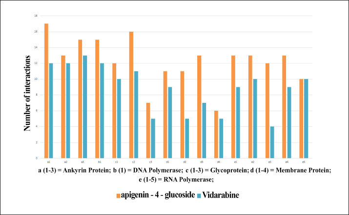 Fig. 4. Total number of protein ligand interactions (y axis) of between selected bioactive compounds with (y axis) ankyrin protein (a1 – a3), DNA polymerase (b1), Glycoprotein (c1 – c3), membrane protein (d1 – d4) and RNA polymerase (e1 – e5); orange color bar represent docking interaction with apigenin-4’-glucoside and cyan color bar represent docking interaction with vidarabine.