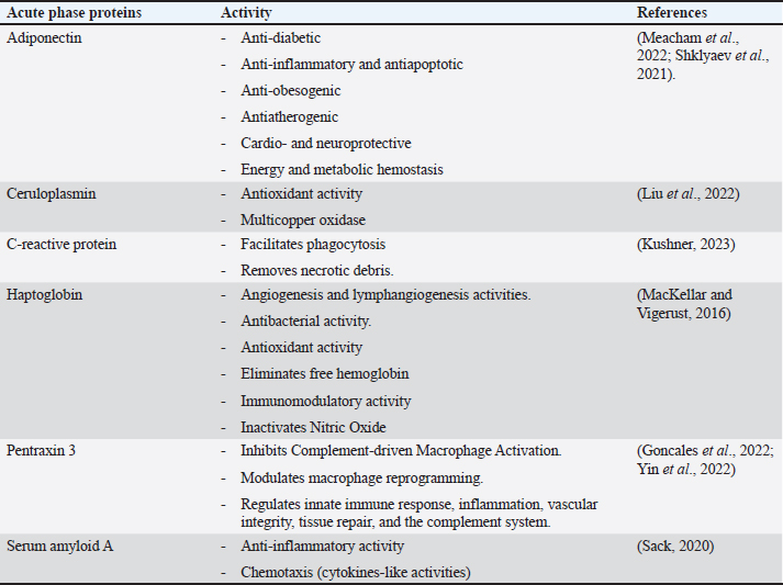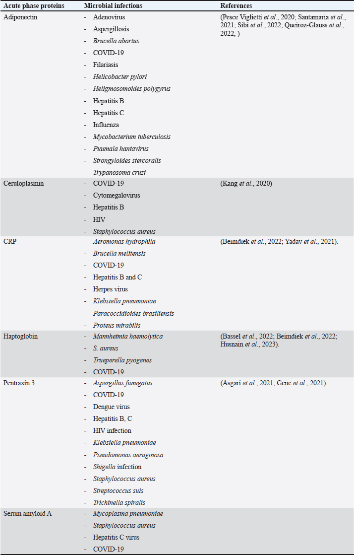 Acute phase proteins that are used as biomarkers for E. coli infectionAdiponectin Table 1 shows the activities of adiponectin as a member of AAPs. It has been shown that mice with knockout adiponectin showed a more severe inflammatory response and kidney damage than wild-type mice after E. coli infection; however, after administration of exogenous adiponectin, the inflammatory response was alleviated. Adiponectin is negatively correlated with CRP and haptoglobin (HP) during acute endotoxemia induced by E. coli (Tvarijonaviciute et al., 2011). Alterations in adiponectin levels are strongly correlated with the existence of normal flora in the intestines, which affects the normal health of the intestines in rats (Peng et al., 2020). Low levels of adiponectin are also correlated with higher E. coli content in the intestines of patients with prostate cancer and metabolic syndrome. Although adiponectin is related to E. coli infection and propagation, it could not be considered a specific marker for E. coli infection. Tables 3 and 4 demonstrate other involvements and associations in many microbial and non-infectious conditions.
