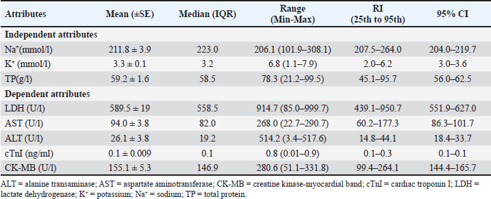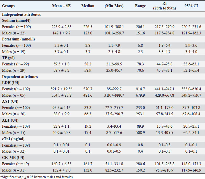 AbstractBackground: For sheep in tropical/subtropical areas of the world, the reported mortality and morbidity rate regarding cardiomyopathies is quite low (1%–2%), yet it has been elucidated that many sheep slaughtered for meat purposes in Pakistan have enlarged hearts with underlying cardiac abnormalities. Aim: The present preliminary work is the first record of deducing normal reference intervals (RIs) for various serum cardiac biomarkers namely cardiac troponin I (cTnI), alanine transaminase (ALT), aspartate transaminase (AST), lactate dehydrogenase (LDH), creatine kinase-myocardial band (CK-MB), sodium (Na+), potassium (K+), and total protein (TP), and their interrelationship in apparently healthy indigenous Sipli breed of sheep (n=141) from Pakistan. Methods: Apropos to aseptic blood collection and serum extraction, the attributes were deduced using commercially available kits. For the sake of analyses, the studied biomarkers were attributed as independent (Na+, K+, and TP) and dependent (LDH, ALT, AST, cTnI, and CK-MB) variables. The RIs were determined through Reference Value Advisor Version 2.1 as per gender and age keeping in view the guidelines provided by the American Society of Veterinary Pathology. Results: The RIs for cardiac serum biomarkers included in the present study were generally within the reference range provided for sheep with slight variations which might be attributed to physiological adaptation to harsh desert climate. The Na+ significantly (p ≤ 0.05) predicted AST (adj. r-square=0.976, 97% probability) and CK-MB (adj. r-square=0.477, 47% probability). Similarly, K+ significantly (p ≤ 0.05) predicted LDH (adj. r-square=0.626, 62% probability) and ALT (adj. r-square=0.897, 89% probability). The TP had the highest adjusted r-square of 0.770 (77% probability) with AST; however, it was statistically non-significant (p ≥ 0.05). Conclusion: The results of the study present baseline data about these cardiac biomarkers which may be utilized for cardiac assessment of the sheep. It is recommended that the serum cardiac biomarkers ascertained in this study be studied in perspective to electrophysiology and ultrasonography of sheep heart for confirmed diagnosis/prognosis of cardiomyopathies. Keywords: Sipli sheep, Cardiac troponins, Reference intervals. IntroductionBiomarkers are specific and distinct biological indicators of various processes and conditions taking place in an organism that are indicative of a certain physiological or pathological event. For human medical sciences, extensive work has been conducted on ascertaining various cardiac biomarkers for an earlier diagnosis/prognosis of cardiomyopathies. Ultimately, creatinine kinase (along with its isoenzyme CK-myocardial band; CK-MB), lactate dehydrogenase (LDH), alanine transaminase (ALT) and aspartate transaminase (AST) have been validated as gold-standards for assessing cardiac health in humans (Siegel et al., 2008). Finally, it has been elucidated that the levels of cardiac troponins (cTnI and cTnT) are far better indicators of cardiac health. Troponin, in fact, is a protein complex, is a part of the thin filament of heart muscles, and consists of three subunits, i.e., Troponin-I, Troponin-C, and Troponin-T (Azzazy and Christenson, 2002; Wells and Sleeper, 2008). Normally, its values are assessed along with those of CK-MB, LDH, AST, and ALT for better diagnostics/prognostics of cardiac myopathy. Regarding veterinary medical sciences, increased levels of the aforementioned cardiac biomarkers in various cattle breeds and pet animals affected with various cardiac pathologies have been reported globally (Nikvand et al., 2019; Sepulveda et al., 2022). However, to the best of our knowledge, no such work on cardiac biomarkers has yet been conducted on indigenous livestock of Pakistan. Though for sheep, the mortality and morbidity rate regarding cardiomyopathies is much lower (1%–2%) (Válková et al., 2024), it has been elucidated that many sheep slaughtered for meat purposes in Pakistan have enlarged hearts with underlying cardiac abnormalities (Z. Saeed, Personal Communication). Pakistan has a temperate to tropical weather and harbors about 31.9 million heads of sheep belonging to 17 different breeds which probably originated from urial (Ovis vignei), the wild sheep of Afghanistan, Baluchistan, and Central Asia (Khan et al., 2008). Sipli is a medium-sized, thin-tailed indigenous sheep breed of Pakistan with a relatively long tail. With an average body weight of 32.8 kg for males and 29.2 kg for females, it has a daily milk yield of 0.2–0.4 l and a fiber yield of approximately 5.6 kg per annum (Jaffar, 2011). It has a white body coat with white or light brown head/ears. Its head is medium sized and has a flat nose with ears reaching about 15 cm long. It is mostly reared for mutton and wool purposes by the nomadic herders of Bahawalpur, Bahawalnagar, and Rahim-Yar-Khan- the three cities lay in the middle of the Cholistan desert, (Southern Punjab) Pakistan. For this sheep breed, our laboratory has recently reported normal physiological reference intervals (RIs) for various serum biochemical attributes (Idris et al., 2024), and a serum color chart for on-field estimation of hemoglobin and bilirubin (Idris et al., 2023). The present preliminary work is the first record of deducing normal RIs for various serum cardiac biomarkers [cTnI, ALT, AST, LDH, CK-MB, Na+, K+, and total protein (TP)], and their interrelationship, in apparently healthy indigenous Sipli breed of sheep from Pakistan. This set of cardiac biomarkers is generally in vogue for assessing cardiac health both in human and veterinary medical diagnostics/prognostics. The results of the study cater a baseline data about these cardiac biomarkers which may be utilized for cardiac assessment of the sheep. Materials and MethodsGeo-location of studyThe present study was carried out simultaneously at the Livestock Farm, Faculty of Veterinary and Animal 