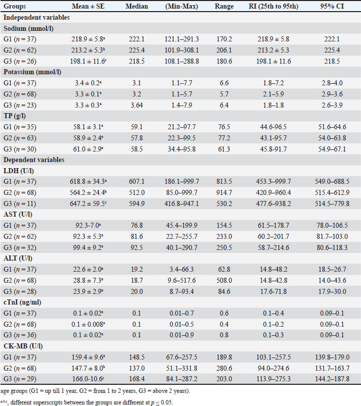 In the present study, CK-MB was higher in G3 animals (166.0 ± 10.6 U/l). Prior research work conducted on humans has established that there is an age-related increase in CK-MB (Perryman et al., 1984; Malasky and Alpert, 2002). Furthermore, CK-MB seems to be elevated without any clear cardiac myopathy as its release is episodic and enhances with skeletal muscle activity in humans (Malasky and Alpert, 2002). For comparison purposes, there is no study conducted on the age-related trend of CK-MB in small ruminants. The same applies to cTnI, which showed no difference within the three age groups of Sipli sheep in the present study. Regarding dependent variables, LDH and CK-MB were statistically different (p ≤ 0.05) between the three age groups. The LDH was significantly higher (p ≤ 0.05) in G1 animals (618.8 ± 34.3 U/l) whereas CK-MB was higher in G3 animals (166.0 ± 10.6 U/l). The AST, ALT, and cTnI were non-significantly different (p ≥ 0.05) between the three studied age groups. According to the results of multivariate analyses, (Table 4), Na+ had a statistically higher (p ≤ 0.01) positive correlation with LDH (r=0.233) whereas K+ had a statistically higher (p ≤ 0.01) negative correlation with LDH (r=−0.587), AST (r=−0.456) and CK-MB (r=−0.495). The Na+ significantly (p ≤ 0.05) predicted AST (adj. r-square=0.976, 97% probability) and CK-MB (adj. r-square=0.477, 47% probability). Similarly, K+ significantly (p ≤ 0.05) predicted LDH (adj. r-square=0.626, 62% probability) and ALT (adj. r-square=0.897, 89% probability). The TP had the highest adjusted r-square of 0.770 (77% probability) with AST; however, it was statistically non-significant (p ≥ 0.05). Table 3. Overall mean (±SE), median, minimum, maximum, range, 25th to 95th percentile of RI) and 95%CI for dependent and independent serum chemistry attributes as affected by age in apparently healthy Sipli sheep (n=141).