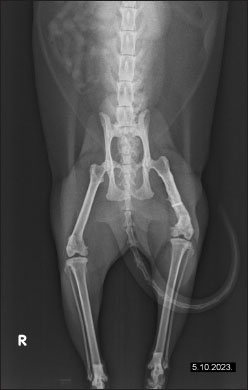 The owner reported continuous improvement, noting that the cat is increasingly bearing weight on the left hind limb, showing fewer signs of pain, and displaying an improved disposition. Follow-up radiographs revealed improvement in the condition of the femur post-therapy (Fig. 4). There is a noticeable improvement in bone structure, indicating enhanced healing and remodeling processes. After 2 months of intensive therapy and visible clinical improvement, the intervals between treatments were further extended. The radiograph shows the bone structure to be more consolidated, indicating effective recovery and remodeling (Fig. 5). Overall, the imaging suggests a positive outcome following treatment. In agreement with the owner, the treatments have continued on a monthly basis, and the cat continues to show progress.