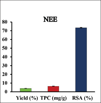 Fig. 1. Three trials were conducted to measure the yield (%), total phenolic content (%), and radical scavenging activity (%) of an ethanolic extract of dry, powdered Nigella sativa roots.