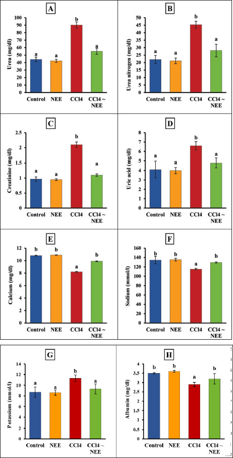 Fig. 3. Effect of CCl4 and NEE on blood urea (A), urea nitrogen (B), creatinine (C), uric acid (D), calcium (E), sodium (F), potassium (G), and albumin (H). Data are presented as Mean ± SD using one-way ANOVA and a post hoc test (Duncan) at p ≤ 0.05. Columns sharing the same symbol are not significant.