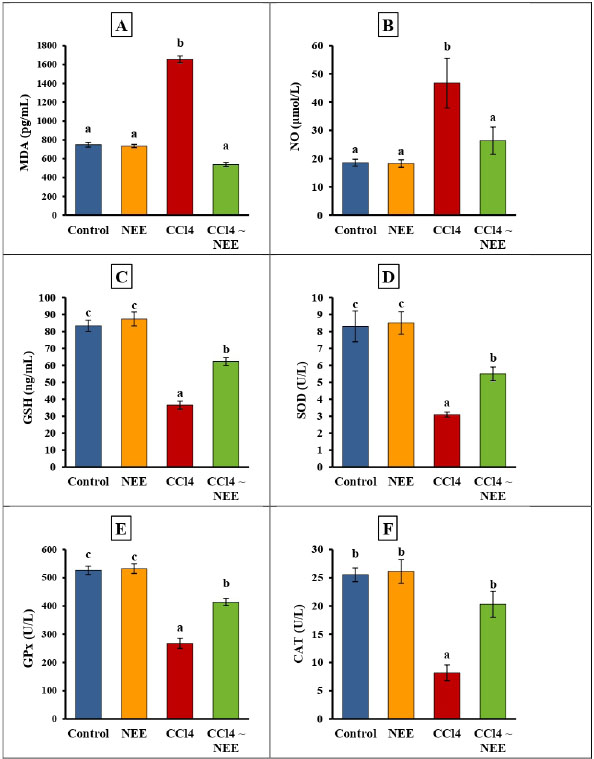 Fig. 4. Effect of CCl4 and NEE on kidney MDA (A), NO (B), GSH (C), SOD (D), GPx (E) and CAT (F). Data are presented as Mean ± SD using one-way ANOVA and a post hoc test (Duncan) at p ≤ 0.05. Columns sharing the same symbol are not significant. HistopathologyThe control group’s evaluation of the renal tissues revealed a normal renal cortex with proximal and distal convoluted tubules (PCTs) and renal corpuscles. The glomerulus of the renal corpuscles, which was comprised of a lobulated tuft of capillaries, was ringed and bordered by the Bowman’s capsule. The PCTs were seen to be more abundant, to have a narrow lumen, and to be bordered by pyramidal cells with indistinct cell borders. They had spherical vesicular nuclei and highly acidophilic cytoplasm (Fig. 6a). The NEE-treated group showed an approximately normal histological pattern of renal tissues (Fig. 6b). In several regions, the tubular architecture of the group that received CCl4 revealed disruption. Some tubules were recognized as basophilic aggregates with poorly defined nuclei, while others were seen as a few dilated tubules with flattened epithelium. Some tubules showed sloughing off parts of their epithelium inside their lumen with the obliterated tubular lumen. It appeared that some tubular cells had acidophilic cytoplasm. A congested glomerular arteriole was detected (Fig. 6c); while the structure of the glomeruli and renal cortical tubules in the CCl4 and NEE-treated group was almost identical to that of the control group. The intact epithelial lining was visible in closely packed cortical tubules (Fig. 6d).