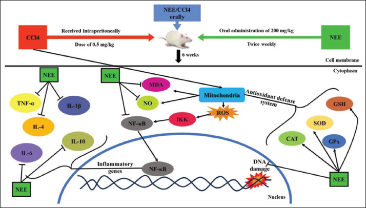 Fig. 8. Schematic diagram depicting the anti-nephrotoxic, antioxidant, and anti-inflammatory efficacy of NEE against CCl4-induced nephrotoxicity in rats. Our results demonstrated that treatment of CCl4 significantly increased renal MDA and NO levels and significantly decreased renal SOD, CAT, GPx, GSH, and DNA fragmentation, as previously reported (Suzuki et al., 2015). The considerable reduction in enzymatic antioxidants was attributed to the renal cortex and medulla’s elevated hydrogen peroxide levels, which are linked to oxidative stress (Gomes et al., 2009). MDA and NO levels were significantly reduced after taking NEE orally, and antioxidant enzymes (renal SOD, CAT, GPx, and GSH) and renal DNA fragmentation were noticeably elevated. This could explain the improvement in catalase, SOD, GSH, and GPx activities, the reported decrease in lipid peroxidation, and the DNA fragmentation in the kidney. Additionally, phytochemical analysis of NEE revealed that it contains advantageous phytochemicals such flavonoids and polyphenols. Gallic acid, amentoflavone, quercetin, apigenin, pcoumaric acid and caffeic acid are polyphenols and flavonoids found in NEE that may contribute to its significant antioxidant capacity and ability to prevent kidney damage from CCl4-induced oxidative stress. Some of these substances, such as CCl4, oxidative stress-related pathways that have been changed by environmental toxicants have been demonstrated to be impacted (An et al., 2016; Akinwumi et al., 2020). Since CCl4 injection caused a considerable increase in inflammatory cytokines (IL-1β, IL-4, IL-6, IL-10, and TNF-α), the new study found a relationship between oxidative stress and inflammatory cytokines. Our results agree with (Marie et al., 2022; Nomier et al., 2022; Noroozi et al., 2024). This connection might be explained by the production of trichloromethyl peroxyl radicals and trichloromethyl that CCl4 causes. Through various processes, the rise in oxidative stress may promote the production of inflammatory cytokines. When oxygen molecules activated NF-jB and activator protein-1 (AP-1), genes encoding inflammatory cytokines were transcriptionally activated. NF-jB significantly impacts the mesangial cell activation that results in renal injury (Wilkins et al., 2011). According to our research, NEE considerably decreased the elevated inflammatory cytokines, most likely due to the suppression of oxidative stress. Through NF-κB suppression, N. sativa is thought to concurrently alter oxidative stress and the inflammatory process (Wilkins et al., 2011). Thymoquinone inhibits the nuclear expression of the NF-B p65 subunit and the in vivo binding of the p50 subunit to the TNF-α promoter (El Gazzar et al., 2007). Numerous additional cytokines, such as TNF-α, IL-1β, and IL-6, act as NF-κB activators in addition to being up-regulated by NF-κB, prolonging the pro-inflammatory status (Ahn and Aggarwal, 2005). Another mechanism, suppression of NF-κB by N. sativa may interrupt these interactions and play a significant impact through its anti-oxidant and anti-inflammatory properties (Woo et al., 2012). The renal histology studies related to the biochemical data. In fact, our findings showed that CCl4 significantly damaged the renal structure, causing obvious glomeruli and tubular damage that was likely brought on by the production of reactive radicals and the subsequent lipid peroxidation brought on by its metabolites. Therefore, the buildup of hydroperoxides in the kidney could result in cytotoxicity linked to the peroxidation of membrane phospholipids, which is the cause of renal cellular damage and necrotic renal cells. Additionally, apoptosis is the second phenomenon that may result from exposure to CCl4 and was evident in the current study by a large rise in Caspase-3, an apoptotic marker, following CCl4-induced nephrotoxicity. Previous investigations showed that exposure to CCl4 caused renal tissues to undergo apoptosis (the cortex and medulla were impacted) (Fang et al., 2021). Similarly, other in-vivo and in-vitro studies (Almeer et al., 2019; Gong et al., 2019; Omotoso et al., 2020) confirmed that CCl4 exposure causes cell death in various human tissues, including the kidney, liver, and testis. The destruction of mitochondrial membranes, significant ROS production, the release of apoptotic factors, activation of caspase-3, disruption of calcium homeostasis caused by stressing the endoplasmic reticulum, increased calcium ion concentration, and activation of numerous apoptosis induction pathways are just a few of the underlying mechanisms. The intrinsic mitochondrial-mediated apoptosis pathway is mostly mediated by caspase-3 (Charlton et al., 2020). The combination of N. sativa medication and exposure to CCl4 had a significant ameliorative impact, thereby protecting the kidney, as shown by the statistically lower blood levels of creatinine, urea, and MDA in the tissues’ histomorphological architecture of the studied kidney. N. sativa was thought to possess anti-inflammatory, anti-apoptotic, and antioxidant qualities that supported its protective effects and made it a potential therapeutic choice for the treatment of induced nephrotoxicity (Charlton et al., 2020). The caspase enzyme family includes caspase-3, a key player in the execution of apoptosis. Although it was mostly detected in injured tubules, certain glomerular and interstitial cells also contained caspase-3 (Hropot et al., 2001). The current findings were consistent with the earlier findings that the CCl4 group had significant Caspase3 immunoreactivity, reflecting the damage caused by CCl4. In contrast, the CCl4 and NEE combined group had significant anti-apoptotic effects and renal protective properties, evident from the decreased Caspase3 expression. The modest Caspase3 immunoreactivity in the NEE-treated rats suggests that NEE is safe for renal tissue. ConclusionIn a rat model of CCl4-induced nephrotoxicity, N. sativa extract improved kid