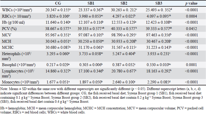 Table 6 presents the blood hematological parameters of Nile tilapia-fed experimental diets. Fish treated with SB1, SB2, and SB3 had significantly higher levels of RBCs, Hb, PCV, MCV, MCH, MCHC, WBCs, heterophils, basophils, lymphocytes, and monocytes than those treated with CG (p < 0.05). The best findings were found in fish that received SB2.