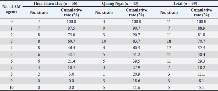 Antimicrobial use is generally accepted as the main driver of AMR, and the relationship between AMU and AMR in animals is, therefore, a topic of considerable interest (Holmer et al., 2019; Jibril et al., 2021; Sali et al., 2021). Our investigation revealed significant associations between AMU (in both prevention and treatment) and the presence of certain AMR phenotypes. The AMR phenotype is common among E. coli indicators isolated from swine in the United States (Spronk et al., 2023) and European countries (EFSA, 2021). Similar to the findings of Kobayashi et al. (2023), the results of this study showed that AMU was associated with resistance not only to AMs belonging to the same AM class (AMX and AMP; GEN and STR) but also to AMs from other classes (AMX and ENR; FLO and DOX). Resistance genes occurring in the same mobile genetic elements and gene cassettes (Birkegård et al., 2017; Partridge et al., 2018) may explain the observed AMR phenotypes and should be addressed in more detail in future investigations. However, not all associations between AMU and AMR phenotypes in this study could be explained. For example, the use of LNZ, STR, and NOR (as treatment) was negatively associated with the presence of the OTC phenotype. In other studies, both corresponding and divergent associations between AMU and AMR, including direct and implicit resistance selection mechanisms, have been reported (Callens et al., 2015; Makita et al., 2016). Makita et al. (2016) suggested that these issues were due to natural, cross- or co-selection based on analyses of AMR in E. coli isolates from swine and AMU. ConclusionSmallholder swine farmers in the two provinces used several essential veterinary drugs (including disinfectants, vaccines, and AMs) on their farms for prevention and treatment. The S. aureus isolates from swine included those from healthy swine that threatened public and animal health. Resistance to some AMs in S. aureus isolates was associated with the use of vaccines, disinfectants, and corresponding AMs, implying that increasing the use of such AMs would increase resistance. These results should help establish countermeasures against AMR in S aureus in smallholder swine farms in Central Vietnam. The findings provide support only for analyses conducted at a single time point: on-farm veterinary drug usage is associated with on-farm AMR. Other complex multifactorial relationships may contribute to the selection of AMR bacteria, which we hope to investigate further in future studies. AcknowledgmentThe authors would like to thank Mr. Hoang Dinh Quoc, who helped us with sampling. We also thank the farmers in Quang Ngai and Hue provinces, who participated in the interviews, provided honest information, and allowed sampling from their pigs. Conflict of interestThe authors declare that they have no conflicts of interest regarding any financial, personal, or other relationships with individuals or organizations related to the material discussed in this manuscript. FundingThis work was supported by a Hue University-level research project (No. DHH2023-02-176. The authors are grateful to the president of Hue University for allowing them to conduct this study. Authors’ contributionsAll authors contributed to the study’s conception and design. Nguyen Van Chao developed the original hypotheses, designed the experiments, and collaborated in interpreting the results. Ho Thi Dung, Bui Thi Hien, and Vu Thi Thanh Tam collected the data for this study, conducted the statistical analyses, and collaborated in the interpretation of the results. Ho Thi Dung, Vu Thi Thanh Tam, Phan Thi Hang, and Bui Thi Hien collaborated in interpreting the results and finalized the manuscript. All authors have read and approved the finalized manuscript. Data availabilityData supporting the findings of this study are available from the corresponding author under the Project funding, upon reasonable request. ReferencesAbreu, R., Rodríguez-Álvarez, C., Lecuona, M., Castro, B., González, J.C., Aguirre-Jaime, A. and Arias, Á. 2019. Increased antimicrobial resistance of MRSA strains isolated from pigs in Spain between 2009 and 2018. Vet. Sci. 6(2), 38. Adesoji, A.T., Onuh, J.P., Bagu, J. and Itohan, S.A. 2019. Prevalence and antibiogram study of Staphylococcus aureus isolated from clinical and selected drinking water of Dutsin-Ma, Katsina state, Nigeria. Afr. Health Sci. 19(1), 1385–1392. Asai, T., Kojima, A., Harada, K., Ishihara, K., Takahashi, T. and Tamura, Y. 2005. Correlation between the usage volume of veterinary therapeutic antimicrobials and resistance in Escherichia coli isolated from the feces of food-producing animals in Japan. Jpn. J. Infect. Dis. 58(6), 369–372. Auplish, A., Vu, T.T.T., Pham Duc, P., Green, A., Tiwari, H., Housen, T., Stevenson, M.A. and Dhand, N. 2024. Capacity and needs assessment of veterinary services in Vietnam in biosecurity, biosafety and One Health. PLoS One 19(1), e0295898. Bak, H. and Rathkjen, P.H. 2009. Reduced use of antimicrobials after vaccination of pigs against porcine proliferative enteropathy in a Danish SPF herd. Acta Vet. Scand. 51(1), 1. Basiry, D., Entezari Heravi, N., Uluseker, C., Kaster, K.M., Kommedal, R. and Pala-Ozkok, I. 2022. The effect of disinfectants and antiseptics on co- and cross-selection of resistance to antibiotics in aquatic environments and wastewater treatment plants. Front Microbiol 13(1), 1. Birkegård, A.C., Halasa, T., Græsbøll, K., Clasen, J., Folkesson, A. and Toft, N. 2017. Association between selected antimicrobial resistance genes and antimicrobial exposure in Danish pig farms. Sci. Rep. 7(1), 9683. Bischofberger, A.M., Baumgartner, M., Pfrunder-Cardozo, K.R., Allen, R.C. and Hall, A.R. 2020. Associations between sensitivity to antibiotics, disinfectants and heavy metals in natural, clinical and laboratory isolates of Escherichia coli. Environ. Microbiol. 22(7), 2664–2679. Blanco, P., Hernando-Amado, S., Reales-Calderon, J.A., Corona, F., Lira