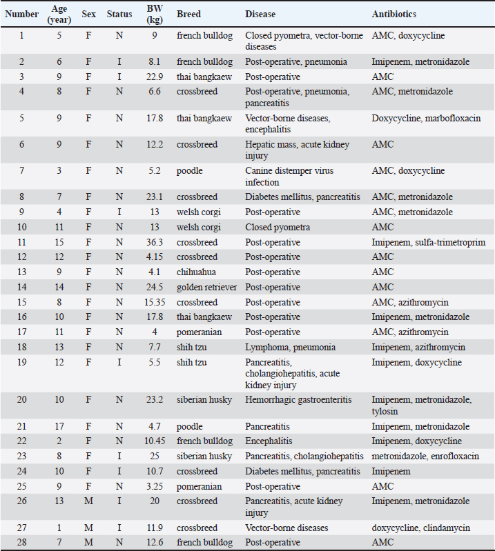 Open Vet. J.. 2025; 15(1): 339-347 Open Veterinary Journal, (2024), Vol. 15(1): 339-347 Research Article Hospital-acquired catheter-associated urinary tract infections in critical care unit dogs with high rates of multidrug-resistant organismsPojchanicha Aponrat1,2, Osathee Detkalaya3, Naruemon Phlongtong4, Natnicha Eksatit5, Suppada Kananub6, Sarawan Kaewmongkol7 and Gunn Kaewmongkol2*1Internal Medicine Unit, Kasetsart University Veterinary Teaching Hospital, Faculty of Veterinary Medicine, Kasetsart University, Bangkok, Thailand 2Department of Companion Animal Clinical Sciences, Faculty of Veterinary Medicine, Kasetsart University, Bangkok, Thailand 3Urology Unit, Kasetsart University Veterinary Teaching Hospital, Faculty of Veterinary Medicine, Kasetsart University, Bangkok, Thailand 4Intensive Care Unit, Kasetsart University Veterinary Teaching Hospital, Faculty of Veterinary Medicine, Kasetsart University, Bangkok, Thailand 5Critical Care Medicine Unit, Kasetsart University Veterinary Teaching Hospital, Faculty of Veterinary Medicine, Kasetsart University, Bangkok, Thailand 6Department of Veterinary Public Health, Faculty of Veterinary Medicine, Kasetsart University, Nakhon Pathom, Thailand 7Faculty of Veterinary Technology, Kasetsart University, Bangkok, Thailand *Corresponding Author: Gunn Kaewmongkol. Department of Companion Animal Clinical Sciences, Faculty of Veterinary Medicine, Kasetsart University, Bangkok, Thailand. Email: gunn_kaew [at] yahoo.com and fvetgunn [at] nontri.ku.ac.th Submitted: 19/11/2024 Accepted: 19/12/2024 Published: 31/01/2025 © 2025 Open Veterinary Journal