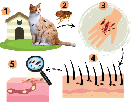 Fig. 1. Transmission process of cat-scratch disease (CSD) caused by B. henselae. The process begins when a domestic cat is infested with fleas, which act as the primary carriers of the bacteria (1). Fleas (C. felis) play a key role as vectors that transmit bacteria to cats (2). When an infected cat bites or scratches a human, it creates an entry point for the bacteria to enter the human body (3–4). Once inside, B. henselae spreads through the bloodstream (5), highlighting the systemic nature of the infection. The chance of developing CSD is increased by frequent contact with cats, particularly kittens, owning or being around a cat that has fleas (Sepúlveda-García et al., 2023). The danger of infection will increase in people with open wounds if an infected cat bites, scratches, or licks the wound (Jurja et al., 2022). Serious consequences of CSD are more likely to occur in people with compromised immune systems (James and Thozhuthumparambil, 2021). CSD is more common in children than in adults, particularly in those aged 5–9 years (Amin et al., 2022). Additional risk factors include not cleaning cat scratches or bites immediately and working with cats, such as veterinarians and animal groomers (Zangwill et al., 1993). Clinical signsBecause the Bartonella species appear to be asymptomatic, nothing is known about their significance as an animal infection. The inquiry is made more difficult by the high rate of infection in healthy animals, the uncertainty surrounding the diagnostic tests for this organism, and the potential for coinfection with other bacteria (Zangwill et al., 1993). Bacteremia is typically asymptomatic in cats that are naturally infected with B. henselae (Regnery and Tappero, 1995). In experimental trials, the majority of cats injected with this organism either showed no symptoms at all or only mild clinical signs, such as eosinophilia, reproductive abnormalities, mild transient anemia, mild nonspecific febrile illness, mild transient behavioral or neurologic symptoms, or inoculation site response (Jurja et al., 2022). A necropsy showed myocarditis in a very sick cat with a flea infection, which may have prevented the cat from mounting a strong immune response to the illness (Breitschwerdt, 2014). Demonstrating that Bartonella causes sickness in naturally afflicted cats is extremely difficult. In humans, B. henselae can spread and infect the liver, spleen, eyes, and central nervous system in certain people. Patients with localized disease typically have a self-limiting condition, whereas those with widespread disease may face potentially fatal outcomes (Lamps and Scott, 2004). The most prevalent clinical sign of CSD is chronic lymphadenopathy (Waseem et al., 2023). Common symptoms include red, aching, and warm lymph nodes (Jurja et al., 2022). Common but minor symptoms include fever and systemic symptoms such as headache, lethargy, malaise, and anorexia (Waseem et al., 2023). Only one lymph node is affected in most patients (around 50%–85%), with the most common lymph nodes being the axillary and epitrochlear, head and neck, and inguinal (Sulaiman et al., 2023). In immunocompetent patients, CSD is characterized by benign regional lymphadenopathy caused by B. henselae (Kunz et al., 2008). Papules and then pustules appear at the inoculation site 7–12 days after experiencing a cat scratch or bite. One to three weeks following inoculation, regional lymphadenopathy may develop and persist for a few weeks to months (Lin and Saccoccio, 2023). Patients with CSD encephalopathy usually fully recover without any problems in a year (Fan and Ali, 2020). Recently, B. henselae has been identified as a frequent cause of both protracted fever and fever of unknown origin in youngsters. Young people with Bartonella infections are also at risk of rheumatic symptoms (Al-Matar et al., 2002). Bacillary angiomatosis is one of the most prevalent clinical signs of Bartonella infection in people with immune system abnormalities (Sala et al., 2005). Patients with B. bacilliformis have chronic vascular proliferative lesions that are histologically and clinically identical to those caused by the bacteria (Rotundo et al., 2024). Bacillary angiomatosis lesions are more likely to occur in HIV-positive individuals with a CD4+ cell count 50/mm3. Histological analysis of cutaneous bacillary angiomatosis revealed a tumor-like growth pattern with epithelioid endothelial cells and significant capillary proliferation (Jung and Paauw, 1998). PathogenesisThe pathogenesis of CSD is poorly understood. The pathogenesis of CSD starts when a tiny wound from an infected cat’s bite or scratch allows the bacteria B. henselae to enter the human body. The bacteria will then proliferate locally in places like the skin and lymph nodes close to the wound (Jurja et al., 2022). After entering the body, the bacteria go to the lymphatic system, where they mostly impact the lymph nodes close to the infection entry site. As a result of this process, the primary symptom of CSD is lymphadenopathy or swelling of the lymph nodes (Hong et al., 2017). Additionally, these bacteria may trigger an inflammatory response in the surrounding tissue, leading to discomfort, swelling, and redness (Harms and Dehio, 2012). These signs may last for a few weeks. Bartonella henselae often only produces mild to moderate symptoms in healthy persons, but in patients receiving immunosuppressive therapy or those with compromised immune systems, such as those with HIV/AIDS, the infection can be more problematic (Mosepele et al., 2012). Rarely, the bacteria may move to the liver, eyes, or heart, where they may result in more severe adverse effects, such as endocarditis and eye conditions (Charles et al., 2023). T and B cells play crucial roles in the body’s immune response to this infection (Jin et al., 2023). The infection may become persistent depending on the immune status of the infected individual. PathologyHistological investigation of skin