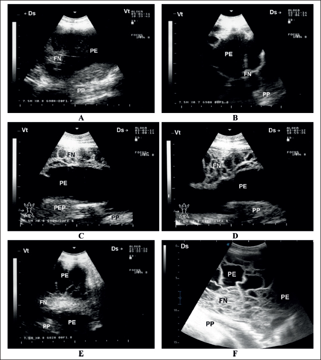 Fig. 2. Sonographic findings in six sheep with contagious caprine pleuropneumonia. Images A and B show PE , mild FN, and compressed PP. Image C shows moderate FN in the absence of PEP. Images D–F show a massive FN in three animals. FN=fibrin network; PE=pleural effusion; PEP=pleural effusion precipitate; PP=pulmonary parenchyma. Postmortem examination revealed unilateral sero-fibrinous pleuropneumonia with a thick yellowish fibrin coat covering the affected lung. Pulmonary hepatization was evident after the removal of the fibrin coat. The cut section showed extensive hepatized and congested parenchyma. A massive amount of fluid exudation was detected within the pleura. The pleural fluid was either straw-colored, bloody, or deep turbid (Fig. 4). Histologically, fibrinous pleuropneumonia was the principal finding. The pleura was greatly thickened with fibrin and leukocytes. The bronchioles and alveoli were obliterated with fibrin threads and inflammatory cells, particularly neutrophils and macrophages. The alveoli were distended with exudate, and congestion of the peri-alveolar vessels was observed. Congestion of the intra-alveolar vessels was observed, with some thrombosis and peri-vascular edema. Multifocal areas of clear tissue carnification were also observed (Fig. 5).