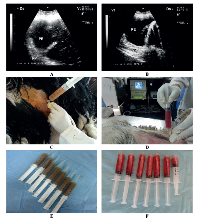 Fig. 3. Ultrasound-guided aspiration of pleuritic fluid in two sheep with contagious caprine pleuropneumonia. Image A shows the sonographic findings of the first case with hyperechoic PE, FN, and compressed PP. Aspiration of the PE was carried out under ultrasound guidance (C), from which approximately 410 ml of deep turbid fluid was collected (E). Image B shows the sonographic findings of the second case with hypoechoic PE, FN, and compressed PP. Aspiration of the PE was carried out under ultrasound guidance (D), in which approximately 127 ml of bloody fluid was collected (F). FN=fibrin network; PE=pleural effusion; PP=pulmonary parenchyma.
