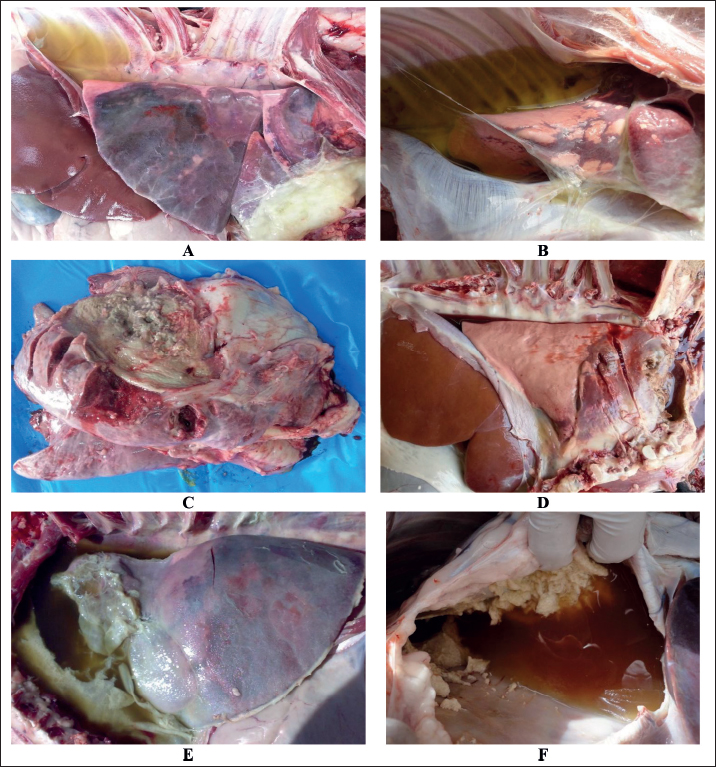 Fig. 4. Postmortem findings in sheep with contagious caprine pleuropneumonia. Images A and B show straw-colored pleural fluid, lung consolidation, and fibrin deposition. Image C shows lung hepatization with fibrinopurulent exudate covering the affected lung. Image D shows consolidated lung with bloody pleuritic fluid. Image E shows consolidated lung, deep turbid pleuritic fluid, and massive fibrin deposition. Image F shows severe fibrin masses with blood-tinged pleuritic fluid.