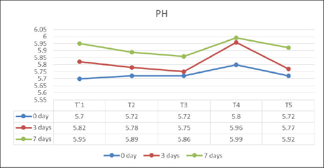Fig. 3. PH value of fresh lamb meat treated with different concentration of BHA and CA during refrigerator storage. Microbial characterizedTotal bacterial count of lamb meatThe present study (Fig. 5) shows a significant (p < 0.05) difference reduction in the total bacterial count of the treated samples compared with the control during storage. The treated sample with T4 (200 ppm) reduced the total bacterial count during the entire storage period to 7.70 ± 0.02, 6.08 ± 0.49, and 5.96 ± 0.46 (log cfu/g), respectively, whereas the total bacterial count was 7.73 ± 0.04, 6.83 ± 0.02, and 6.80 ± 0.09 (log cfu/g) for T3 (150 ppm) in all storage periods compared with the control group; T1 (without added) increased the total bacterial count during all storage periods to 7.88 ± 0.02, 8.07 ± 0.06, and 8.08 ± 0.42 (log cfu/g), respectively. Significant differences were detected between the groups during the storage period.