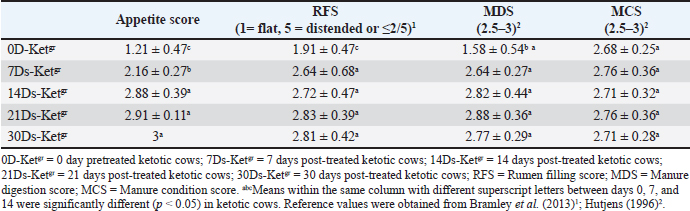 Table 2. Mean values of the appetite score, RFS, MDS, and MCS in pretreated and post-treated ketotic cattle (n=50).