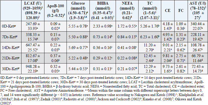 Risk factors, clinical findings, and clinical scoring dataKetotic cattle are often thought to be at risk for a variety of postpartum diseases, including DA, mastitis, and/or retained placenta. Of the 50 (100%) cows, 20 (40%) retained placenta, 15 (30%) had DA, five (10%) had mastitis, and 12 (24%) had no problems at all. There were no significant variations in the values of temperature, pulse rate, or respiratory rate of the sick ketotic cows between days 0 (pre-treatment), 7, 14, 21, and 30. Each value was within the physiological reference range. Significant (p < 0.05) elevations in ruminal movement values were reported in 7Ds-Ketgr, 14Ds-Ketgr, 21Ds-Ketgr, and 30Ds-Ketgr compared with their values in 0D-Ketgr, whereas they had become within their reference intervals by the 7th day post-therapy. BCS in ketotic cows showed no clear changes between days 0, 7, 14, 21, and 30; thus, BCS values were still within their reference intervals (Table 1). There was an improvement in clinical scoring data, including appetite score, RFS, and MCS as a response to treatment as they were remarkably (p < 0.05) raised in 7D-Ketgr, 14Ds-Ketgr, 21Ds-Ketgr, and 30Ds-Ketgr compared with their values in 0D-Ketgr, whereas they restored their reference intervals by the 7th day post-therapy. The MDS values showed no significant variations between days 0 and 30 in ketotic cattle and were still within their reference intervals (Table 2). These changes were correlated with the clear improvement in appetite and rumen movement observed in days 7–30 following therapy. Serum lipid profilesBlood lipid profiles in Ketotic cattle post-therapy showed clear improvement including elevations of blood levels of LCAT, apoB-100, glucose, and TC as well as reductions of blood concentrations of BHBA, NEFA, and AST were noticed in days 7–30 compared with their pretreatment values in day 0 (Table 3). The serum activities of LCAT were highly changed after therapy in ketotic dairy cattle as they were significantly (p < 0.05) raised in days 7–30 following treatment compared with those on day 0 (Pretreatment). Nevertheless, they remained below the reference values even after treatment (Days 7–21). Thirty days post-therapy as a follow-up period was needed by recovered dairy cows to restore their reference values of serum LCAT (Table 3). Ketotic cattle had remarkably (p < 0.05) lower concentrations of serum apoB-100 in 0D-Ketgr than their post-therapeutic values in days 7–30 and their reference intervals. Clear improvement in serum apoB-100 levels was observed following therapy, whereas the reference values were reached on day 14 posttherapy (Table 3). The current study reported no significant variations in serum glucose levels in ketotic cows either pretherapy (Day 0) or posttherapy (Days 7, 14, 21, and 30). Moreover, the blood glucose levels of the investigated dairy cows were within the reference intervals (Table 3). The serum concentrations of BHBA were significantly (p < 0.05) higher in ketotic cows before therapy (0D-Ketgr) than in 7Ds-Ketgr, 14Ds-Ketgr, 21Ds-Ketgr, and 30Ds-Ketgr. Later on, a significant (p < 0.05) drop in serum BHBA values was reported as a response to therapy in days 7–30 whereas they restored their reference values by the 14th day. Serum BHBA levels reached their lowest levels in post-therapeutic ketotic cows on day 21 (21Ds-Ketgr) (Table 3). Post-therapeutic ketotic cattle in days 7–30 had significantly (p < 0.05) lower values of serum NEFA levels than those on day 0 (0D-Ketgr). The serum NEFA concentrations in the investigated dairy cattle reached their reference ranges on day 14 following therapy. The serum NEFA levels reached their lowest levels in post-therapeutic ketotic cows on day 21 after treatment (Table 3). The present study revealed significantly (p < 0.05) higher serum levels of cholesterol, i.e., TC, CE, and FC, following therapy in ketotic cows on days 7, 14, 21, and 30 compared with their values in the 0D-Ketgr. However, serum cholesterol concentrations were within reference ranges throughout the present study (Table 3). The reported results showed severe reductions in serum enzyme activities of AST in post-therapeutic ketotic cattle, whereas their values in 7Ds-Ketgr, 14Ds-Ketgr, 21Ds-Ketgr, and 30Ds-Ketgr were remarkably (p < 0.05) lower than those in pretherapeutic ketotic cattle (0D-Ketgr). Dairy cows needed a 14-day follow-up period (Post-therapy) to restore their reference intervals of serum AST (Table 3). The study reported a significant negative correlation between serum NEFA and apoB-100 levels in ketotic cattle either pre- or post-therapy where the remarkable elevation of NEFA levels on day 0 was associated with clear declines in serum apoB-100 levels. In contrast, the significant reduction in serum NEFA levels after treatment (Days 7–30) was correlated with a significant increase in serum ApoB-100 levels ( r=?0.642, p < 0.05; Sig. 2-tailed=0.0033) (Table 4). Table 3. Mean values of serum lipid profiles in pre-treated and post-treated ketotic cattle (n=50)