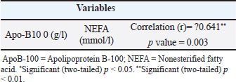 Table 4. Pearson‘s correlation coefficient between serum apoB-100 and NEFA levels in ketotic cows.