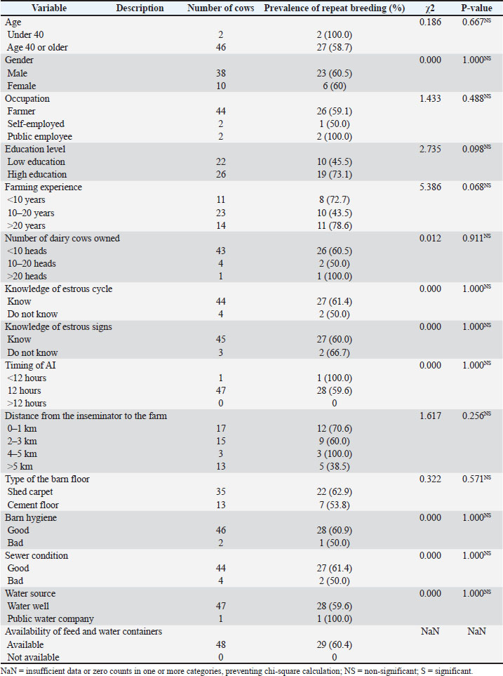 Prevalence of repeat breedingThe prevalence of repeat breeding was 28.8% (47/163) and 60.4% (29/48) at the individual and farmer levels, respectively (Table 1). Analysis of risk factors at the cow levelAt the cow level, where repeat breeding was detected in 28.8%, several risk factors were analyzed to determine the associated factors (Table 2). No significant association (p > 0.05) was observed between factors such as age, parity, timing of AI, and body condition score with repeat breeding. However, milk yield, herd size, and history of reproductive disorders were significantly associated (p < 0.05). Among cows producing less than 10 l of milk per day, 54.3% were repeat breeders, compared with only 15.1% among cows producing 10–20 l of milk per day. Although the overall chi-square test for milk yield was significant (χ²=27.888, p < 0.001), the group producing >20 l/day had no cows and was excluded from the post-hoc analysis. Cows producing less than 10 l/day had 6.71 times the odds of repeat breeding compared with those producing 10–20 l/day. For herd size, repeat breeding occurred in 36.8% of cows in herds with fewer than 10 cows, compared with 8.6% in herds of 10–20 cows and 5% in herds of more than 20 cows. A significant association was found between herd size and repeat breeding (χ²=10.674, p=0.005). Cows in herds with fewer than 10 cows had 3.57 times greater odds of repeat breeding than those in larger herds. Post hoc pairwise comparisons were performed between the three herd size categories (<10, 10–20, and >20 heads), and p-values were adjusted using Bonferroni correction to account for multiple comparisons (Supplementary File). The comparison between cows in herds with fewer than 10 animals and those in herds with more than 20 animals revealed a statistically significant difference, with cows in smaller herds having 3.49 times higher odds of experiencing repeat breeding (OR=3.49, 95% CI: 1.25–9.74; Bonferroni-adjusted p=0.0370). Although the comparison between <10 and 10–20 head herds suggested elevated odds (OR=3.69, 95% CI: 1.02–13.26), it did not remain significant after adjustment for multiple comparisons (Bonferroni-adjusted p=0.1357). No significant difference was observed between the 10–20 and >20 head herd groups (p=1.000). Finally, 68.4% of the cows with a history of reproductive disorders were repeat breeders, whereas only 23.6% of the cows without such a history experienced repeat breeding. A significant association was found between a history of reproductive disorders and repeat breeding (χ²=8.639, p=0.003). Cows with a history of reproductive disorders had a 3.03 times higher chance of repeat breeding than those without a history of reproductive disorders. Analysis of risk factors at the farmer levelDespite the high prevalence of repeat breeding at the farmer level (60.4%), no significant relationships (p > 0.05) were found between the high prevalence of repeat breeding and any variables investigated due to a lack of response variance (Table 3). DiscussionEnrekang Regency has the largest dairy population in the eastern part of Indonesia. However, the Central Bureau of Statistics showed that the population of dairy cows has decreased considerably since 2020, at 1011, 1026, 1016, and 565 heads in 2021, 2022, and 565 heads in 2023 (Central Bureau of Statistics, 2024). This might be due to the typically low reproductive performance of smallholder farms. Yusuf and Sahiruddin (2020) stated that the reproductive performance of dairy cows in Enrekang Regency was 2.05 ± 1.49 times, 214.79 ± 166.35 days, 274.51 ± 5.10 days, and 490.16 ± 167.81 days for service per conception times, interval from calving to conception, duration of pregnancy, and calving interval, respectively. Furthermore, the prevalence of repeat breeding in dairy cows reached 31.57% for primiparous and 29.62% for pluriparous cows in 2021 (Muhuruna et al., 2023). According to the sociodemographic results, which were similar to Nadhira and Sumarti (2017), most farmers were men because women often do not fully control livestock farming in Indonesia, and decision-making by females remains primarily at the household level. The current problem in the agriculture sector is the low youth interest in becoming farmers, with only 4.2% of farmers being old. This condition may threaten the sustainability of future agricultural businesses (Prayoga et al., 2020; Nurlaela et al., 2022). However, in addition to age, education level may influence access to information and understanding of management practices (Athambawa et al., 2021). Owing to the importance of the farm economy, repeat breeding has been intensively investigated in many countries and areas. Juliana et al. (2015) reported a prevalence of repeat breeding in beef Bali cows in Pringsewu Regency of 19.85%, while Nasution et al. (2021) reported a prevalence of 17.3% in beef cattle in North Labuhanbatu Regency. Similarly, Subagio et al. (2019) found a 21.12% prevalence of repeat breeding in Jombang beef cows. Yusuf et al. (2012) and Damayanti et al. (2020) also reported a higher incidence of repeat breeding in dairy cows in Sinjai and beef cattle in Banyuwangi Regency, reaching 62% and 64%, respectively. At the farmer level, the prevalence rate of repeat breeding among dairy cow farmers was 20.64% in Batu and 29.4% in Daerah Istimewa Yogyakarta (Prihatno et al., 2013; Arningdiah et al., 2024). The results showed that the prevalence of repeat breeding in Cendana District, Enrekang Regency, at the cow level (28.8%) was comparable to recent studies by Muhuruna et al. (2023), which observed a 31.57% and 29.62% prevalence for primiparous and pluriparous cows, respectively. In contrast, the prevalence of repeat breeding at the farmer level (60.4%) was significantly higher than that in previous studies. The prevalence of repeat breeding may differ based on the characteristics of the area and sociodemographics. In Indonesian smallholder farms, where