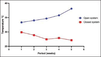 Fig. 1. Weekly temperature degrees in open and closed systems during the summer.