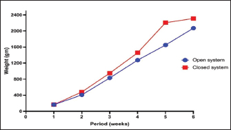Fig. 2. Broiler growth rate in the summer in open and closed houses. Table 2. A comparison of the production and economic performances of broilers in open and closed systems.