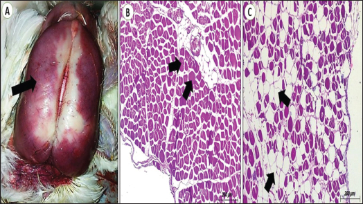 Fig. 4. Breast muscle of the examined chicken (open system). A) Grossly showing dark red coloration (arrow) with whitish spots. B) The breast muscle section suffered from Zenker necrosis (arrows) with fat vacuoles between muscle fibers (H&E stain, scale bar, 50 um). C) Complete replacement of the muscle with fat vacuoles (arrows) (H&E stain, scale bar, 200 um). The examined brain sections showed congestion of most blood vessels with degenerative and vacuolation in the brain tissue (Fig. 3B). Meanwhile, the pectoral muscle suffered from coagulative necrosis with fat vacuoles between muscle fibers, and some cases showed complete replacement of the muscle with fat vacuoles in the absence of the muscle fiber (Fig. 4B and C). Liver sections show congestion of the portal vein and hepatic sinusoid (Fig. 5A), with fibrosis around the portal vein and bile duct. Bile duct showing mild hyperplasia with newly formed bile ductules (Fig. 5B). Kidney sections showing congestion of sub-capsular blood vessels (Fig. 6A), as well as congestion of inter-tubular blood capillaries. Additionally, glomeruli show congestion of glomerular blood vessels with necrosis of the glomerular tuft epithelium, whereas renal tubules show vacuolation and sloughing of renal tubular epithelium (Fig. 6B and C). DiscussionPoultry production is essential on a global scale because of its contributions to food security, economic development, job creation, and nutrition (Shosha et al., 2024). In general, poultry are exposed to a broad and diverse array of stressors, including environmental, biological, nutritional, and production factors (Abdel-Kareem et al., 2025). Closed-system farms are important for disease control, biosecurity, animal health, and risk management (Fotouh et al., 2020). There was a highly significant variation between the open (7.02) and closed systems (7.82) in a number of cycles/year. This might be due to broiler chickens in the closed system reaching marketing age in less time of period with controlled feeding and temperature than in the open system. The results were in the same line as those obtained by Atapattu et al. (2017), who stated that the open house system reported a significantly lower number of growing cycles/year (4.4) than the closed house (6.9). This is due to the number of growing cycles per year being impacted by numerous factors, including the number and availability of chicks and market conditions. Our results revealed that there was a significant increase in ABW and WG in the closed system (2.31 and 2.27 kg, respectively) compared to the open system (2.07 and 2.03 kg, respectively). Similar results were obtained by Atapattu et al. (2017), who reported that broilers in the open system showed significantly lower final live weight (1,922 g) compared to those under the closed one (1,974 g). FCR is the quantity of feed that broilers need to generate 1 kg of live weight. According to Marom et al. (2020), who noted that the ratio of FI to WG over a period is known as FCR. Patterson (2001) found that the value of FCR could be more efficient if it reaches the number < 2 for the maintenance of broiler chickens. In our results, FCR showed a very significant difference between the open system (1.93) and the closed one (1.65). Our findings were in agreement with Atapattu et al. (2017), who said that FCR in an open system (1.94) was higher than closed one (1.56). In contrast, Farida et al. (2022) noted no significant difference in FCR between open (1.554) and closed systems (1.516) in broiler chickens. The percentage of mortality was significantly (p < 0.01) higher in the open system compared to the closed one. This is owing to that broiler chickens have homoeothermic (warm-blooded) characteristics of body temperature of 40°C–41°C because they do not have sweat glands and all body covered with feathers (Farida et al., 2022). Therefore, high mortality % in open systems may be due to uncontrolled climatic conditions especially in summer with high temperatures in contrast to the closed one that supported with ventilation and cooling system. Our results agreed with Farida et al. (2022), who noted mortality percentage in the closed system was 3% and the open one was 4.14%. In addition, Nuryati (2019) reported a 7.70% mortality % in open systems in broiler chickens. Susanti et al. (2016) revealed that the mortality % was 13.07% in the open system of broiler. The performance index is used to find out the success of poultry rearing, counting the index of performance. From our results, performance index values revealed a highly significant difference between the open (224.48) and closed system (377.1). On the same trend, Farida et al. (2022) reported that the performance index in the closed system (389) was higher than in the open one (358). In addition, Zaki et al. (2025) found a decrease in the performance index in the open system that ranged from 260 to 370 and an increase in value in the closed one that ranged from 400 to 420. This means that the performance and production of broilers in the closed system were better than in the open one. As Levy (2017) reported that the closed system showed a better growth performance than the open one. Concerning the economic indices, profit efficiency refers to a company’s capacity to maximize profits based on its pricing and fixed elements, while profit inefficiency is the lack of profit resulting from the failure to operate at the highest level of efficiency. In this study, the total costs were slightly higher for the closed system (139.23 EGP/bird) compared to the open one (138.79 EGP/bird), but the closed system demonstrated greater temporal utilization efficiency of resources (utilized the available housing spaces more effectively) to achieve better returns for profit maximization. In our results, between the two systems, there were notable differences in NP and total return; they were 162.1 and 22.88 EGP, respectively, for the closed system, while they were 145.