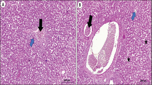 Fig. 5. Liver section picture of the examined chicken (open system) showing A) congestion of the portal vein and hepatic sinusoid (black arrow) with fibrosis around the portal vein and bile duct with mild hyperplasia of the bile duct and newly formed bile ductules (blue arrow) (H&E stain, scale bar, 200 um). B) Hydropic degeneration of hepatocytes (black stars) with severely dilated central veins (black arrow) and newly formed bile ductules (blue arrow) (H&E stain, scale bar, 200 um).