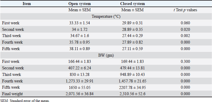 Histopathological examinationTissue specimens from the brain, pectoral muscle, liver, and kidney were collected from three freshly dead chickens (30–40 days old). Each sample was 1–2 cm thick, fixated, processed, and treated with 10% neutral buffered formalin. After proper fixation (24–48 hours), the samples were dehydrated in ascending grades of ethyl alcohol, cleared in xylol, embedded in paraffin, and finely blocked. The samples were sectioned at 5 μm in thickness and stained with hematoxylin and eosin (H&E). Dehydrate again in ascending ethanol concentrations (95%, 100% ethanol) and then clear in xylene, as described earlier. Mount the stained slides with a mounting medium (e.g., DPX or Permount) and cover them with a glass coverslip for microscopical examination (Elbarbary et al., 2024). Statistical analysisThe statistical procedures were performed using the computer programs SPSS/PC+ “version 23” (SPSS, 2015). The study was analyzed using an independent t-test after checking the normality of the distribution and homogeneity using Levene’s test to test the effect of housing systems on the productivity and profitability of broiler farms. In this study, using a confidence level of 95%, the t-test hypothesis was as follows: if a significant value t ≤ 0.05, then Hₒ is rejected (Hₐ accepted), and if a significant value t > 0.05, then Hₒ is accepted (Hₐ rejected). Ethical approvalThis study protocol was established by ensuring ethics and rules for experimental animals and was approved by the Scientific Research Ethics Committee of the Faculty of Veterinary Medicine, Aswan University, Protocol number 10-2-2024. ResultsTable 1 and Figure 1 show a significant variation in temperatures among all weeks from the first to the fifth weeks. The open system showed a highly increase temperature than the closed system. This was due to the temperature conditions in the closed system being controlled with automatic tools for maintenance and the comfort of broiler chickens. BW was also shown in Table 1 and Figure 2, with a highly significant increase in the closed system to the open one from the second week until the final weight. This was due to the effect of temperature on the environment of broiler chickens affecting their FI, which in turn affected their production performance. Table 2 shows the difference between the open and closed systems in the space of birds/m2 (10.5 and 11.67 birds/m2, respectively). In addition, there was a highly significant variation between the open (7.02) and closed systems (7.82) in terms of the number of cycles/year. From our results, we revealed no significant difference in total FI between the open (3.91 kg) and the closed system (3.74 kg). This little FI decreases in closed systems due to the use of automatic feeders, better feeding system management, and less feed wastage. Our results showed a significant increase in average body weight (ABW) and WG in the closed system (2.31 and 2.27 kg, respectively) than in the open system (2.07 and 2.03 kg, respectively). FCR is a measure of efficiency for the feed that broiler chickens consume to maximize their growth, as the lower the FCR value, the more efficient it is. Our results revealed that the average FCR was 1.93 and 1.65 for the open and closed systems, respectively. This demonstrates that the feed consumption value significantly differs between the open and closed systems. High temperatures are one of the factors that influence the mortality percentage, according to our data. Our results found a highly significant difference between the open (4.4%) and closed systems (0.23%) in heat mortality% and 15.96% and 5.46% in mortality%, respectively. Higher production performance was associated with a lower harvest age for high-weighted crops and a better performance index. The performance index values show a highly significant difference between the open (224.48) and closed systems (377.1). This means that a closed system is better than an open one for the maintenance and production of broiler chickens. Regarding the economic indices, the feed cost and total cost showed nonsignificant differences between the two systems; the feed cost was higher for the open system (91.04 EGP/bird) than for the closed one (88.79 EGP/bird), while the total costs were slightly higher for the closed system (139.23 EGP/bird) compared to the open one (138.79 EGP/bird). However, total return and NP differ significantly between the two systems. They were 162.1 and 22.88 EGP, respectively, for the closed system and 145.1 and 6.3 EGP, respectively, for the open one. The profitability index for open and closed broiler houses in Egypt, as reported in our study, was 0.04 and 0.14, respectively. Table 1. Effect of housing systems in the summer season on broiler growth rate.