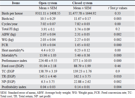 ABSTRACTBackground: Proper animal welfare and economic benefits are essential for the broiler industry. Aim: This study assessed the productivity and profitability of open and closed broiler production systems in Egypt, with a particular focus on the histopathological effects of heat stress on broiler health. Methods: Data were collected from 18 broiler cycles, involving 186,300 broiler chicks (9 cycles for each system for about 6 months). The independent t-test was used to analyze data and assess outcomes. Results: According to the findings of the broiler performance study, the study was analyzed using an independent t-test to test the average body weight and performance index that significantly increased in the closed system (2.31 kg and 377.1, t ≤ 0.05, respectively) compared to the open system (2.07 kg and 224.48, t ≤ 0.05, respectively) with better feed conversion ratio and lower mortality rate in the closed system (1.65% and 5.46%, t ≤ 0.05, respectively) than in the open one (1.93% and 15.96%, t ≤ 0.05, respectively). Additionally, the profitability index for open and closed broiler houses in Egypt, as reported in our study, was 0.04 and 0.14, t ≤ 0.05, respectively. This indicates that for every 100 EGP earned as revenue, 4 EGP are returned to the farmer as net income in the open system, whereas 14 EGP are returned in the closed system. Moreover, heat-stressed birds in an open system induced several pathological alterations in different organs, such as blood vessel congestion, degeneration, and vacuolation of breast muscle and parenchymatous organs (liver and kidney). Conclusion: Productive and economic performance favors fully automated climate-controlled broiler housing; thus, a closed system is recommended for broiler farm owners. These improvements are crucial because they can directly contribute to increased profitability and sustainability in poultry farming, especially in regions experiencing extreme heat stress. Keywords: Broilers welfare, Open and closed systems, heat stress pathology, Closed housing profitability. IntroductionEffective business development begins with entrepreneurs who encounter numerous challenges in the business landscape. The broiler business is one of the most important agricultural sectors in Egypt, which attracts investment, primarily due to the enormous internal market for poultry meat consumption, coupled with the growing population and increased per capita consumption (Fotouh et al., 2024). Poultry industries, particularly broiler production, serve as a significant economic foundation with great potential for boosting economic growth and creating numerous job opportunities (Hamiyanti et al., 2023). According to Atapattu et al. (2017), greater scientific knowledge about the economic, social, environmental, and production performance of chicken production systems is necessary before undertaking such an undertaking. According to the Food and Agriculture Organization, global chicken meat production is steadily increasing. For instance, global broiler production reached approximately 133 million metric tons in 2022, and it is expected to continue growing due to the increasing demand for affordable protein sources, particularly in developing nations (Aggrey and Rekaya, 2024). The house, where all poultry activities take place, is a key component of a successful broiler farm. To ensure that the chickens are healthy and productive, the house must be comfortable. Open- and closed-house systems are the two main types of housing systems; the climate of an open house is definitely uncontrolled. In contrast, a closed house allows the climate to be adjusted as needed, minimizing temperature and humidity changes and reducing the density of the house (12–14 chickens/m2) compared to an open house (8–10 chickens/m2) (Purnomo and Santosa, 2007). Broiler farming is a capital-intensive business, and a closed-house system provides high revenue and profitability during each raising period. The income generated is a key indicator of a farm’s economic health, serving as a foundation for potential business expansion (Sarjana and Setiadi, 2018). Subkhie and Saleh (2012) reported that the causes affecting the high value of feed conversion rate (FCR) include overfeeding and improperly positioned feed, which result in feed waste. Additionally, high temperatures and chickens suffering from diseases, especially respiratory diseases, lead to decreased appetite. Body weight (BW), FCR, and mortality percentage all have an impact on the performance index, which is a number that displays the success rate of broiler chicken production reared for a certain period (Farida et al., 2022). Unang and Sumarsih (2014) reported that the performance index in broiler chickens in open houses ranged from 340 to 360, whereas in closed houses, it could reach 400. The failure of the body to cope with increased temperatures may result in adverse pathological changes at both the macroscopic and histological levels of vital organs. The housing system has a significant impact on broiler health and performance of boilers. Systems that provide optimal air quality, space, temperature, and disease control while promoting natural behaviors tend to lead to better overall welfare, health, and performance. Conversely, poor management or restrictive systems can lead to stress, disease, and reduced growth rates. A balance between welfare considerations and production efficiency is key to optimizing both the health and performance of broilers (Mesa et al., 2017). The gross changes in heat-stressed birds were dehydration (sunken eyes, dry skin), Pale comb and wattles, edema (swelling of the neck, eyes, abdomen), congested organs (liver, lungs, kidneys), and postmortem changes such as rapid rigor mortis. Thus, such establishment of cellular changes can lead to an understanding of the mechanisms associated with the adaptation of livestock to heat stress (Rebez et al., 2023). In regions with extreme 