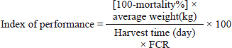 5. The number of dead chickens is known as the mortality rate, which is calculated daily and then expressed as a percentage after each cycle. Determination of economic indices1. Fixed costs (depreciation of buildings and equipment) were included in the production costs. Additionally, variable costs (drugs, vaccines, disinfectants, veterinary supervision, feed, chicks, litter, labor, and electrical costs during the entire production cycle/chick) are also incurred (Atallah, 2000). The total cost is equal to the sum of all fixed and variable expenses (Abd-El Hamed and Kamel, 2021). 2. Total return: The market pricing at the time of the study was used to compute the returns from the sales of both live BW and litter (Ibrahim, 2017). 3. Net profit (NP)=total return total cost (Kato et al., 2022). 4. The profitability index was calculated according to Atapattu et al. (2017)