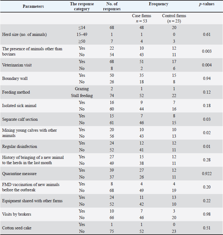 ABSTRACTBackground: Foot and mouth disease (FMD) is a highly infectious disease, affecting animals with divided hooves. FMD has seen significant outbreaks in East Java, Indonesia, highlighting the urgent need to understand the risk factors contributing to its emergence in this region. FMD spreads easily across borders and leads to significant economic losses due to illness, death, and trade limitations. Aim: The current study aimed to identify risk variables connected to the FMD outbreak in East Java. Methods: We conducted risk factor investigations for FMD in seven districts of East Java province, in collaboration with the Faculty of Veterinary Medicine at Airlangga University and the Department of Livestock, East Java. A case–control study of 76 (case=53, control=23) livestock farms with a case−control ratio of approximately 2:1 was conducted in East Java, Indonesia. Data on multiple possibly correlated parameters were collected using a standardized questionnaire. Results: Univariate analysis of the current study showed that five risk factors (the presence of animals other than cattle, visits of the veterinarian, calf sections, mixing young calves with other animal species, and regular disinfection) were significantly associated (p < 0.05) with the occurrence of FMD. Multiple logistic regression showed that visiting veterinary doctors (odds ratio [OR]=0.08, 95% CI=0.01–0.52, p=0.008), regular disinfection (OR=3.98, 95% CI=1.06–14.93, p=0.04), and sharing equipment between healthy and infected farms (OR=3.39, 95% CI=0.95–12.1, p=0.04) were significantly associated with the FMD outbreak in the vicinity in 2022. Conclusion: Strengthening biosecurity protocols, limiting admissions of animals lacking documented vaccination records, and ensuring routine vaccination against FMD are all effective countermeasures to significantly reduce and alleviate the prevalence of FMD on Indonesian livestock farms. Keywords: Biosecurity, East Java, Foot and mouth disease, Risk factors, Vaccination. IntroductionFoot and mouth disease (FMD) is a highly contagious viral disease that affects livestock and has significant economic implications. The disease affects various species of cloven-hoofed ruminants, including cattle, swine, sheep, goats, and other similar animals. The disease occurs in outbreak form and is caused by a virus, often known as Foot and Mouth Disease Virus, an RNA virus classified within the Aphthovirus genus and the Picornaviridae family (Domingo et al., 2002; Belsham, 2005; Can-Sahna et al., 2024). The bovine respiratory disease complex, which causes bronchopneumonia, arises from a complex array of factors, including infectious agents, host-related variables, environmental stresses, and the interactions among these elements (Khan et al., 2024; Ozbek et al., 2024; Tursunov et al., 2024). It is believed that the earliest descriptions of FMD were made in cattle in Italy during the 16th century (Grubman and Baxt, 2004). FMD is endemic in Asia, South America, Africa, and the Middle East; however, the World Organization of Animal Health (WOAH) has designated 69 countries as FMD-free (WOAH, 2002). There are seven immunologically distinct serotypes, designated as A, O, C, SAT1, SAT2, SAT3, and Asia1 (Spickler and Roth, 2015). The most prevalent serotypes in South America, Africa, and Asia are O and A (Di Nardo et al., 2011; Lloyd-Jones et al., 2017; WHO, 2022; WHOA, 2022). The SAT and Asia 1 serotypes are typically limited to Africa and Asia, respectively; however, there have been instances where they have spread to other areas (Wubshet et al., 2019). Serotype C, which was last identified during outbreaks in Brazil and Kenya in 2004, seems to be nonexistent in animals and may even be extinct, while there are worries about iatrogenic re-introduction with vaccinations due to laboratory escapes or poor deactivation (Sangula et al., 2011; Paton et al., 2021; Chen et al., 2022). FMDV serotype O, namely the O/ME-SA/Ind-2001e sub-lineage, is responsible for the outbreak that is currently occurring in Indonesia (Chen et al., 2022). After 36 years of ofnoo FMD cases in animals in Indonesia, the disease reemerged in livestock species in different foci of the country in 2022 and created great concern among livestock owners. Despite the lack of clear evidence, it is believed that the source of this problem is the illegal import of animals (Thomson et al., 2003) and may be from neighboring countries (Cambodia, Lao PDR, Malaysia, Myanmar, Thailand, and Vietnam), in which Serotype O is endemic (Chen et al., 2022). On April 12, 2022, in the province of East Java, the disease was identified in cattle for the first time. In light of the 3,496 instances certified by the WOAH in the provinces of East Java and Aceh on May 6, 2022, Indonesia’s FMD-free designation was revoked as of April 12, 2022 (Indonesia, 2022; Zainuddin et al., 2023). As of November 3, 2022, out of a total population of 54,767,135 livestock, there have been 570,137 cases of the disease (which corresponds to a morbidity rate of 1.04%), 9,785 deaths (which corresponds to a mortality rate of 0.02%), 12,650 livestock have been culled, and 5,199,595 have been vaccinated. The majority of reported cases were found in cattle (94.27%), followed by buffalo (4.56%), goats (0.80%), sheep (0.36%), and swine (0.02%) (Ministry of Agriculture, Republic of Indonesia, 2022). The present outbreak of FMD is posing considerable economic and biosecurity problems for Indonesia, with damage estimated to range from $1.37 to $6.60 billion US dollars (Indonesia, 2022; Karyza, 2022) because farmers had not been routinely vaccinated their animals against FMD in the recent past and Indonesian naïve population was entirely open to infection (Belsham, 2020; Zhang et al., 2024). Even if the Indonesian authorities have identified the strain of the current outbreak, that is, harming animals (Belsham, 2020), it will take some time to either import sufficient doses of an e