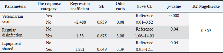 Variables are included in the final model Five of the 15 variables were chosen for inclusion in the multiple logistic regression analysis based on the criterion that the p-value was less than 0.05. Of these five variables, only three variables (visiting of veterinarians on the farms, regular disinfection, and sharing of equipment between farms) were significantly associated with the occurrence of FMD based on p < 0.05 (Table 2). DiscussionIn Indonesia, 2022 marked the beginning of an outbreak of FMD (Chen et al., 2022), a critical transboundary disease that quickly swept through the country (Chen et al., 2022). The virus is highly contagious and has the potential to spread over national and international borders, posing significant risks to the national food supply chain and economy (Ali et al., 2022; Chen et al., 2022; Kabir et al., 2024). There is a paucity of accessible data on the risk factors of cattle farms in Indonesia. Although FMD is expected to re-emerge in 2022, it is expected to cause huge economic losses in terms of morbidity, loss of production, abortion, medication, and mortality. Table 2. Summary of parameters in final mode.