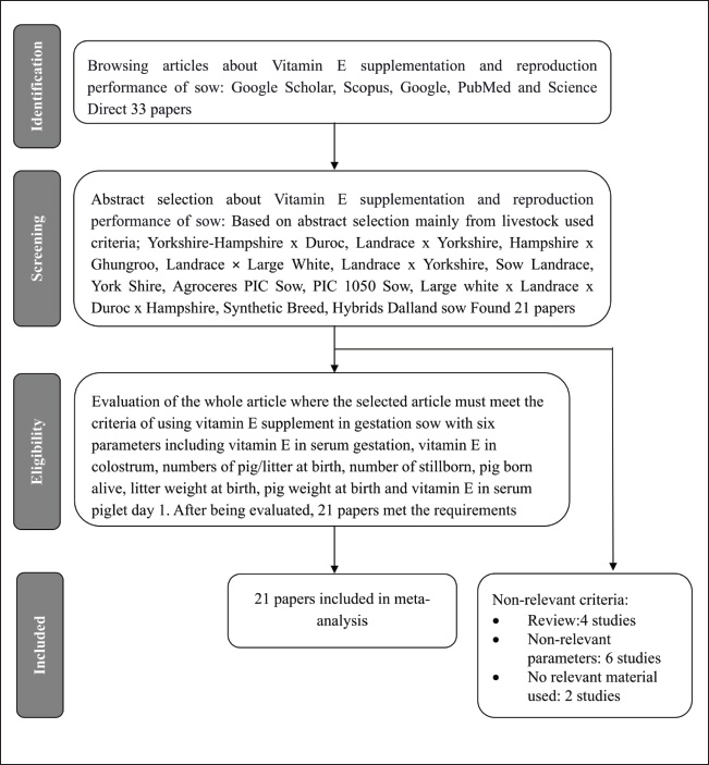 ABSTRACTBackground: Vitamin E is an antioxidant that plays a crucial function in the reproductive processes of pigs. Aim: This study evaluated the reproductive efficacy of ɑ-tocopherol or vitamin E supplementation in pregnant sows. Methods: Twenty-one articles from 1977 to 2021 were included in the database. There were eight parameters observed, such as concentration in the serum during gestation, colostrum concentration, number of piglets per litter at birth, number of stillborn piglets, number of piglets born alive, litter weight at birth, weight of each piglet at birth, and piglet serum concentration on day 1. The data were analyzed using the PROC MIXED procedure in SAS version 9.1. Results: Vitamin E administration in sows led to a statistically significant rise in the level of α-tocopherol in the serum of both sows during gestation and the serum of piglets on the first day after birth. The injection of vitamin E did not yield a statistically significant effect on the observed variables, including an increase in the number of pigs per litter at birth, stillborn piglets, pigs born alive, litter weight at birth, vitamin E levels in colostrum, dan the weight of piglets at delivery. Conclusions: Vitamin E supplements are advisable for female pigs to increase the concentration of α-tocopherol in serum throughout pregnancy and enhance α-tocopherol levels in the serum of piglets on the first day after birth. Keywords: ɑ-Tocopherol, Antioxidant, Pregnancy, Swine. IntroductionVitamin E, a lipid-soluble antioxidant, protects monounsaturated and polyunsaturated fatty acids (PUFA and MUFA) and cholesterol in cellular membranes from free radical damage (Zingg, 2023). This antioxidant exhibits fat-soluble characteristics in cell membranes. Because pigs cannot synthesize vitamin E endogenously, it must be incorporated into their diet (Lauridsen and Litta, 2018). Numerous food sources contain vitamin E, including vegetable oils, fruits, nuts, vegetables, oats, bran, barley, wheat, and palm oil (Neophytou and Constantinou, 2015; Zaaboul and Liu, 2022). Research has demonstrated that vitamin E is essential for reproductive function in both male and female animals and humans (Siddiqui et al., 2021; Md Amin et al., 2022; Gao et al., 2023). Antioxidant properties contribute to the maintenance of normal female reproductive system function (Md Amin et al., 2022). In females, vitamin E influences menstruation, ovulation, oocyte quality, and maturation. Deficiency during pregnancy can result in miscarriage, premature birth, preeclampsia, and intrauterine growth restriction (IUGR) (Siddiqui et al., 2021). Studies on vitamin E supplementation in pigs have yielded different outcomes. Some researchers have observed that supplementing sow feed with vitamin E during gestation increased its levels in serum (Chen et al., 2016; Jeong et al., 2019), colostrum (Chen et al., 2016), piglets born alive (Parraguez et al., 2021), weight at birth, and the number of total piglets born (Kumar et al., 2020). Conversely, other studies have reported no significant effects on vitamin E content in stillbirths, live-born piglets (Becerra, 2017; Santos et al., 2019; Jeong et al., 2019), total number of piglets born, piglet weight at birth, serum piglet weight at birth (Jeong et al., 2019), and piglet weight at birth (Wang et al., 2017; Jeong et al., 2019). Despite these discrepancies, a comprehensive meta-analysis is required. Meta-analysis measures and investigates variations in study results, helping to identify potential sources of bias and apparent discrepancies (Mohapatra and Sengupta, 2016; Tatsioni and Ioannidis, 2024). The primary objective of this study was to conduct a meta-analysis to evaluate the impact of vitamin E oral and injection supplementation in pregnant sows on the reproductive performance of pigs. Materials and MethodsEthics statementsThis study was a meta-analysis review article; therefore, ethical approval was not required. Database developmentThis meta-analysis was conducted in accordance with the Preferred Reporting Items for Systematic Reviews and Meta-Analyses (PRISMA) principles (Hidayat et al., 2020). The data were obtained from publications published between 1977 and 2021. A comprehensive literature search was conducted using keywords such as “Vitamin E,” “ɑ-tocopherol,” “pig,” “sow,” “gilts,” “reproductive performance,” “fertility,” “gestation,” and “pregnant” on search engines including Google Scholar, Scopus, PubMed, ScienceDirect, and Directory of Open Access Journals (DOAJ) to identify relevant articles. Inclusion/exclusion criteriaThe inclusion criteria were as follows: (1) articles published in English by reputable publishers such as Google Scholar, Scopus, PubMed, ScienceDirect, and DOAJ; (2) appropriate experimental design; (3) sufficient experimental and replication materials; (4) pig-specific animal experiments; (5) vitamin E dose in mg/day or convertible to mg/day; (6) reproductive performance parameters; (7) adequate sows (n); and (8) criteria for administering vitamin e orally or by injection. Data extractionInput data from selected articles included author name, publication year, journal name, pig type, number of pigs, vitamin E treatment dose, observed parameters, recommended dose, vitamin E source, parameter units, sampling technique, and measurement techniques. Thirty-three studies on vitamin E supplementation in sows were initially conducted. Twenty-one studies met the inclusion criteria based on titles and abstracts. Vitamin E studies were compiled using assessed variables, including serum gestational vitamin E levels, serum vitamin E levels in piglets on day 1, number of pigs per litter at birth, number of stillborn piglets, number of live-born piglets, litter weight at birth, colostrum vitamin E levels, and piglet weight at birth. Following a comprehensive evaluation, 21 articles were selected and incorporated into the designated databases 