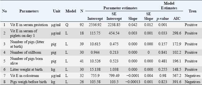 Open Vet. J.. 2025; 15(7): 3206-3215 Open Veterinary Journal, (2025), Vol. 15(7): 3206-3215 Research Article Effects of vitamin E supplementation on sow gestation: a meta-analysisNi Wayan Helpina Widyasanti1, Sari Yanti Hayanti2*, Cecep Hidayat2,3, I. Putu Cahyadi Putra1, Jonathan Anugrah Lase2, Ragil Angga Prastiya4, Surya Surya2, Maureen Chrisye Hadiatry2, Marchie Astrid da Costa2, Nandari Dyah Suretno2, Reny Debora Tambunan2, Franciscus Rudi Prasetyo Hantoro2, Susana Insusila Watyning Rakhmani2 and Yenny Yusriani21Faculty of Veterinary Medicine, Udayana University, Denpasar, Indonesia 2Research Center for Animal Husbandry, Research Organization for Agriculture and Food, National Research and Innovation Agency of The Republic of Indonesia (BRIN), Cibinong Sciences Center, Cibinong, Indonesia 3Animal Feed and Nutrition Modeling Research Group, Faculty of Animal Science, IPB University, Bogor, Indonesia 4Departement of Health, Medicine, and Life Sciences, Faculty of Health, Medicine, and Life Sciences (FIKKIA), Universitas Airlangga, Surabaya, Indonesia *Corresponding Author: Sari Yanti Hayanti. Research Center for Animal Husbandry, Research Organization for Agriculture and Food, National Research and Innovation Agency of The Republic of Indonesia (BRIN), Cibinong Sciences Center, Cibinong, Indonesia. Email: sari029 [at] brin.go.id Submitted: 19/01/2025 Revised: 26/05/2025 Accepted: 16/06/2025 Published: 31/07/2025 © 2025 Open Veterinary Journal