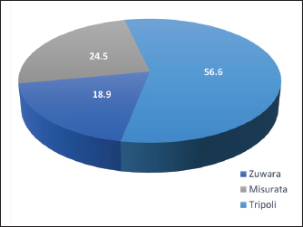 Fig. 1. Fishing areas used in fishing Angel sharks in Tripoli port, Libya. The majority of fishers (69.8%, n=37) reported capturing five or more Angel sharks in the 12 months preceding the interviews. However, all reported captures were incidental bycatch because there are no targeted fisheries for angel sharks in Libya. Fishers reported that encounter depths varied depending on the fishing gear used. Users of Artisanal gear encountered Angel sharks at shallow depths as little as 10 m, while trawlers reported encounters at depths of up to 200–300 m. The overall average capture depth was 124.02 m. Similarly, distances from the coast where Angel sharks were encountered ranged from 3 nautical miles (for artisanal gear) to 200 nautical miles (for trawlers), with an overall average of 60.27 nautical miles. A strong positive correlation was found between distance from the coast and fishing depth (Spearman’s rs=0.69, p < 0.001), indicating that Angel sharks are more frequently encountered in deeper, offshore waters.