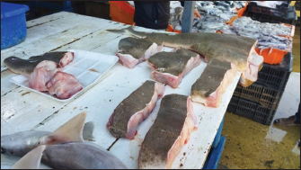 Fig. 5. Common Angel shark Squatina squatina on display at Tripoli fish market (A Hamza ©). Integrating ongoing LEK monitoring with scientific surveys can provide a comprehensive understanding of the status of Angel sharks, enabling more adaptive and effective management strategies. ConclusionThis study confirms that critically endangered Angel sharks persist in Libyan waters and face severe threats. Local fishers’ knowledge, combined with our morphometric data, reveals that all three Mediterranean species are present, mainly juveniles caught as bycatch. Tripoli appears to be a key area, underscoring this for effective protection. Declining catches, linked to pollution and destructive fishing, demand immediate action. The national elasmobranch action plan must be effectively implemented and strengthened, focusing on these threats. The key priorities are bycatch reduction, habitat protection, and prohibition of illegal fishing practices. Community engagement remains crucial. The identified Important Shark and Ray Areas must be legally protected as a priority. AcknowledgmentsThe authors thank the anonymous reviewers for their insightful feedback and valuable suggestions, which helped strengthen this manuscript. The authors are also grateful to the fishermen of Tripoli Port who generously shared their time and expertise during the interviews. Conflicts of interestThe authors declare no conflicts of interest. FundingThis research did not receive any specific grant. Authors’ contributionsAbdulmaula Hamza led the conceptualization, data curation, formal analysis, and supervision of the study and was responsible for writing, review, and editing. Amal Abdel-Aziz Abunaqassa, Nusalba Adel Al-Qrew, and Noura Milad Saleh contributed to the field and lab investigations, methodology development, and visualization of the research results. All authors have reviewed and approved the final manuscript. Data availabilityThe manuscript contains all the data supporting the findings of this study. Any additional information needed is obtainable from the corresponding author upon justifiable request. ReferencesAwruch, C., Nostro, F., Somoza, G. and Giacomo, E. 2008. Reproductive biology of the angular Angel shark Squatina guggenheim (chondrichthyes: squatinidae) off patagonia (Argentina, southwestern Atlantic). Cienc. Mar. 34(1), 17–28; doi:10.7773/cm.v34i1.1232 Bakiu, I., Xharra, B., Colatosti, R. and Gancio, R. 2020. Angel Shark (Squatina squatina) occurrence and condition in the Albanian coast and offshore waters. Aquat. Conserv. 33(S2), 243–255; doi:10.1002/aqc.3429 Barker, J., Davies, J., Goralczyk, M., Patel, S., O’Connor, J., Evans, J., Sharp, R., Gollock, M., Wood, F.R., Rosindell, J., Bartlett, C., Garner, B.J., Jones, D., Quigley, D. and Wray, B. 2022. The distribution, ecology and predicted habitat use of the critically endangered angel shark (Squatina squatina) in coastal waters of Wales and the central Irish Sea. J. Fish Biol. 101(3), 640–658; doi:10.1111/jfb.15133 Bass, A.J., d’Aubrey, J.D. and Kistnasamy, N. 1975. Sharks of the east coast of Southern Africa. V. The families Hexanchidae, Chlamydoselachidae, Heterodontidae, Pristiophoridae, and Squatinidae. Invest. Rep. Oceanogr. Res. Inst. 43, 1–50. Berkström, C., Papadopoulos, M., Jiddawi, N.S. and Nordlund, L.M. 2019. Fishers’ local ecological knowledge (LEK) on connectivity and seascape management. Front. Mar. Sci. 6, 130; doi:10.3389/fmars.2019.00130 Bradai, M.N., Enajjar, S. and Saidi, B. 2022. Sharks’ status in the Mediterranean sea urgent awareness is needed. In: Sharks-past, present and future. London, UK: IntechOpen; doi:10.5772/intechopen.108162 Coll, M., Piroddi, C., Steenbeek, J., Kaschner, K., Ben Rais Lasram, F., Aguzzi, J., Ballesteros, E., Bianchi, C.N., Corbera, J., Dailianis, T., Danovaro, R., Estrada, M., Froglia, C., Galil, B.S., Gasol, J.M., Gertwagen, R., Gil, J., Guilhaumon, F., Kesner-Reyes, K., Kitsos, M.S., Koukouras, A., Lampadariou, N., Laxamana, E., López-Fé de la Cuadra, C.M., Lotze, H.K., Martin, D., Mouillot, D., Oro, D., Raicevich, S., Rius-Barile, J., Saiz-Salinas, J.I., San Vicente, C., Somot, S., Templado, J., Turon, X., Vafidis, D., Villanueva, R. and Voultsiadou, E. 2010. The biodiversity of the mediterranean sea: estimates, patterns, and threats. PLoS One 5(8), e11842; doi:10.1371/journal.pone.0011842 Colloca , F., Carrozzi, V., Simonetti, A. and Lorenzo, M. 2020. Using local ecological knowledge of fishers to reconstruct abundance trends of elasmobranch populations in the strait of sicily. Front. Mar. Sci. 7, 508; doi:10.3389/fmars.2020.00508 Compagno, L.J.V., Dando, M. and Fowler, S. 2005. Sharks of the world. Princeton, NJ: Princeton University Press. Damalas, D. and Vassilopoulou, V. 2011. Chondrichthyan by-catch and discards in the demersal trawl fishery of the central Aegean Sea (Eastern Mediterranean). Fish. Res. 108(1), 142–152; doi:10.1016/j.fishres.2010.12.012 Dulvy, N.K., Simpfendorfer, C.A., Davidson, L.N.K., Fordham, S.V., Bräutigam, A., Sant, G. and Welch, D.J. 2017. Challenges and priorities in shark and ray conservation. Curr. Biol. 27(11), R565–R572; doi:10.1016/j.cub.2017.04.038 Dulvy, N.K., Pacoureau, N., Rigby, C.L., Pollom, R.A., Jabado, R.W., Ebert, D.A., Finucci, B., Pollock, C.M., Cheok, J., Derrick, D.H. and Herman, K.B. 2021. Overfishing drives over one-third of all sharks and rays toward a global extinction crisis. Curr. Biol. 31(21), 4773–4787; doi:10.1016/j.cub.2021.08.062 Ellis, J.R., Barker, J., McCully Phillips, S.R., Meyers, E.K. and Heupel, M. 2021. Angel sharks (Squatinidae): a review of biological knowledge and exploitation. J. Fish Biol. 98(3), 592–621; doi:10.1111/jfb.14613 FAO. 2020. The State of Mediterranean and Black Sea Fisheries 2020. General Fisheries Commission for the Mediterranean, Rome, Italy: FAO; doi:10.4060/cb2429en Figus, E., प्रदेशसे, A., Battaglia, P., Russo, T., D’Onghia, G. and Sion, L. 2017. Local ecol