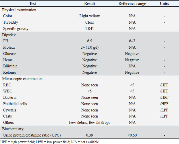 Table 3. Urine analysis including Urine Protein to Creatinine ratio when the cat was diagnosed with renal lymphoma. Only proteinuria was found.