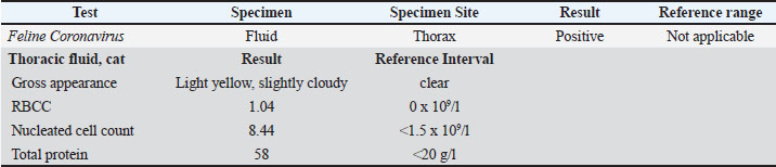 Thoracic radiographs revealed a large amount of pleural effusion. Therapeutic thoracocentesis was performed, and the fluid was submitted for evaluation. Fluid analysis showed an exudate with a high protein count, and a proteinaceous background with neutrophilic and macrophage inflammation; negative aerobic culture for bacteria (Fig. 3). A PCR test for feline coronavirus was performed on the fluid, and a positive result was obtained (Table 5).
