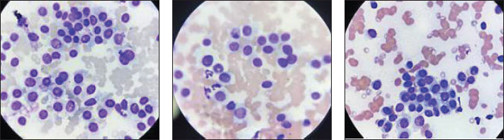 After staining, cytological investigation revealed several mesenchymal cells without malignant features, including cells with round morphology and cytoplasm vacuoles, coarse chromatin, or nucleoli (Fig. 2). A few inflammatory cells among many erythrocytes were identified in the background. No typical bacteriological or fungal infections were observed.