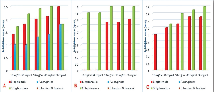 Fig. 4. How big are the zinc oxide nanoparticlesʼ (ZnO-NPs) zones of inhibition against S. epidermidis, P. aeruginosa, S. enterica serovar Typhimurium, and E. faecium (S. faecium). Concentrations of ZnO-NPs produced by auto-combustion reaction, uncapped nanoparticles created by auto-combustion procedure, and starch-capped nanoparticles created using sonochemical technique are shown in A, B, and C, respectively.