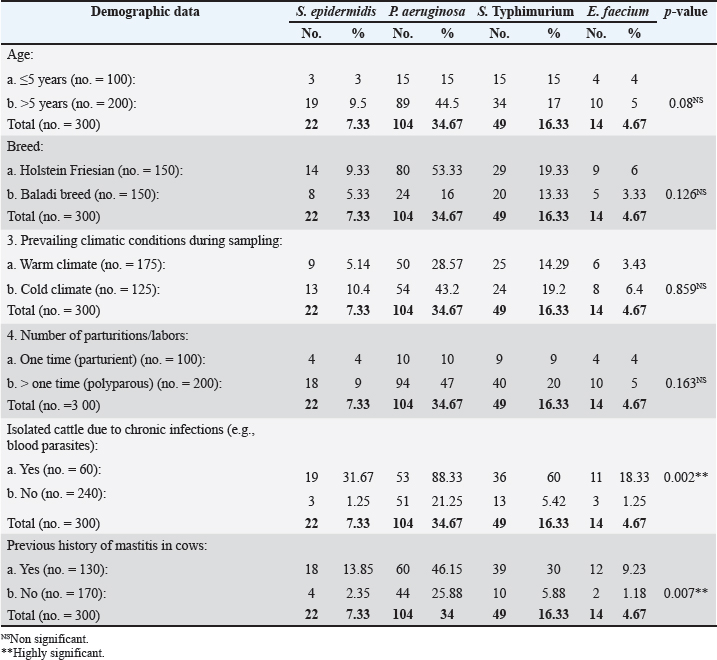Generally, Table 3 illustrated that the prevalence percentage of the four examined zoonotic pathogens (S. epidermidis, P. aeruginosa, S. Typhimurium, and E. faecium) is higher among cattle aged more than 5 years, Holestein Friesian breeds, samples collected during cold climate, polyparous cows, cattle with history of chronic infections (such as blood parasites), and those with the previous history of mastitis than among those of younger ages, Baladi breeds, samples collected during warm climate, parturient, and those without chronic infections and without previous signs of mastitis.