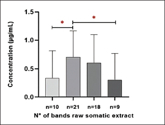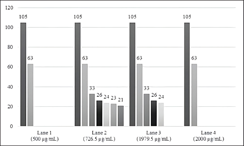 Fig. 4. Intensity of the protein bands of paramphistomids somatic crude extract, stained with silver, according to the different protein concentrations and number of parasites analysed. Lane 1 (63, 105 kDa); lane 2 (21, 23, 24, 26, 33, 63, 105 kDa); lane 3 (24, 26, 33, 63, 105 kDa); lane 4 (63, 105 kDa). A significant difference was also found in the concentration of the somatic crude extract protein (µg/ml) and the number of separated bands (kDa) of paramphistomids (p < 0.05), as shown in Figure 5.