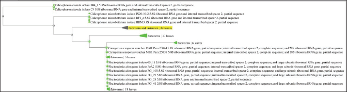 Fig. 6. Molecular phylogenetic analysis of Calicophoron microbothrioides by Sanger sequencing. DiscussionIn Cajamarca, the region with the highest fresh milk production in Peru (INEI, 2012), paramphistomiasis has received very little attention in terms of research and control, despite its high prevalence due to the presence of favorable environmental factors (temperature and humidity) (Torrel-Pajares et al., 2022). While previous studies exist on parasitic incidence and the correlation between parasite load and the presence of adult forms, the molecular characterization of these trematodes remains limited, hindering the development of more sensitive diagnostic techniques (Coronado et al., 2023). In this context, the molecular identification performed provides important evidence supporting the taxonomic classification of the analyzed paraphistomids. Sequencing of the ITS-2 region followed by BLAST alignment revealed 100% similarity to C. microbothrioides. This is consistent with previous studies reporting that ITS-2 is a suitable conserved molecular marker for family- and genus-level discrimination in trematodes. However, given its limited resolution in closely related species, this explains the occurrence of highly similar sequences from taxa such as Paramphistomum cervi in alignment analyses. Therefore, while ITS-2 sequencing is useful for molecular confirmation, multilocus approaches that improve species-level resolution should be considered. This could strengthen the interpretation of subsequent proteomic analyses. Currently, the diagnosis of paramphistomiasis is based primarily on fecal examination, a technique with low sensitivity, especially in the acute phase of infection. In contrast, the application of proteomic approaches to other trematodes such as Fasciola hepatica has allowed the identification of candidate antigens for immunology and vaccination (Johnston et al., 2009). Therefore, understanding the antigenic profile of paramphistomids is fundamental, as this is a necessary step for the future development of more precise diagnostic strategies and for laying the groundwork for vaccine development. The protein profile of paramphistomids, molecularly characterized as C. microbothrioides, obtained by SDS-PAGE in this study, showed 21 protein bands between 15 and 119 kDa at an optimal concentration of 726.5 µg/ml. This is comparable to that reported by Anuracpreeda et al., (2016), who observed 26 bands with MWs between 12 and 170 kDa in Paramphistomum gracile. Likewise, somatic proteins with MWs between 10 and 150 kDa have been reported in Paramphistomum cervi (Abdullah et al., 2019). In the case of Paramphistomum epiclitum, 15 bands have been reported with weights ranging from 8 to 169.3 kDa (Jyoti et al., 2014). These differences in band size and number are related to the variability of species analyzed in each study and are probably due to genomic heterogeneity (Mattison et al., 1994). In addition, the differences could be related to interspecific variations, differences in the extracts used, the number of parasites processed, or gel conditions. In comparison with other trematodes, Dezhabad et al. (2023) reported 12 protein bands with variable MWs ranging from 26 to 263 kDa for Fasciola hepatica. Similarly, Abdolahi et al. (2016) conducted a study with Fasciola hepatica and F. gigantica, revealing 30 protein bands ranging from 18 kDa to 180 kDa, with band intensities between 22.5 kDa, 27 kDa, 31 kDa, and 62 kDa MW. This differs from the findings in this study, possibly due to the difference in trematode species. The literature reports that the interaction between a parasite and its host is crucial in the parasite’s protein expression (De Vera et al., 2009). Therefore, variations in the parasite’s protein electrophoretic profile may exist depending on the definitive host due to the impact of its immune response. Thus, host-type variability has been reported to induce changes in the protein electrophoretic profile of Schistosoma japonicum (Hong et al., 2011). Similarly, De Vera et al. (2009) found the existence of exclusive bands in the protein electrophoretic profile of Fasciola hepatica and F. gigantica for Bubalus bubalis, unlike Bos taurus. Similarly, Paramphistomum epiclitum has been observed, for which 16 protein bands between 14 and 76 kDa have been reported in parasites isolated from goats and sheep (Jadav et al., 2018), and for buffalo, 23 bands between 14 and 115.5 kDa (Hussain, 2013). Protein characterization of the crude somatic extract of adult paramphistomids was performed using polyacrylamide gel electrophoresis. A significantly higher number of protein bands (n=21) were observed at a concentration of 726.5 µg/ml compared to the other concentrations tested (500 µg/ml, 1,979.5 µg/ml, and 2,000 µg/ml). This difference is possibly related to the saturation of the polyacrylamide gel pore diameter and protein migration. Finally, it is important to note that further research is needed to identify the antigenicity, immunogenicity, and immunodominance of the proteins identified in this study. Some of the identified bands may be related to proteins that have been previously reported. Thus, the purified 16 kDa immunogenic protein from Paramphistomum gracile is a protein with high specificity that does not exhibit cross-reactivity with other parasites Anuracpreeda et al., (2016) ConclusionThe results of the present study revealed a profile of 21 protein bands from the somatic extract of adult forms of parasites of the family Paramphistomidae in cattle by SDS-PAGE electrophoresis technique, this finding suggests that at a protein concentration of 726. 5 µg/ml a greater number of protein bands can be exhibited which presented a MW within a range of 15–119 kDa (15, 21, 23, 24, 26, 33, 33, 38, 40, 46, 50, 56, 56, 59, 63, 70, 77, 91, 96, 100, 105, 113 and 119 KDa), it is necessary to mention that these proteins obtained from local parasites of Paramphistomidae should 