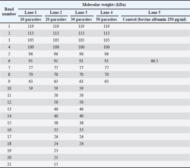 Using the SDS-PAGE method with silver staining, it was observed that the number of protein bands of the paramphistomids somatic crude extract was variable according to the concentration of the protein analysed. Thus, concentration 2 showed the highest number of protein bands (21 bands) with MW within a variable range of 15 kDa to 119 kDa; about the other concentrations analysed, in concentration 1, 10 bands were separated (59 kDa–119 kDa), concentration 3, 18 bands were separated (24 kDa–119 kDa). In concentration 4, 9 bands were separated (63 kDa–119 kDa) (Table 1). When analysing the protein bands on the polyacrylamide gel, a total of 9 standard bands were observed that appeared at the four concentrations used, with a variable range between 63 kDa and 119 kDa (63, 70, 77, 91, 96, 100, 105, 113, and 119 kDa) (Fig. 3).