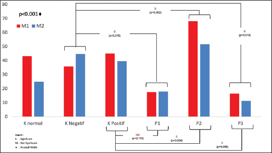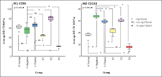 Results: There was a significant difference in M1, which was higher than M2 in the AND group, compared with KP. The number of M2 macrophages in the P2 group was significantly lower than that in the KN group. Similarly, the number of M2 macrophages in the P3 group was significantly lower than that in the KN group.